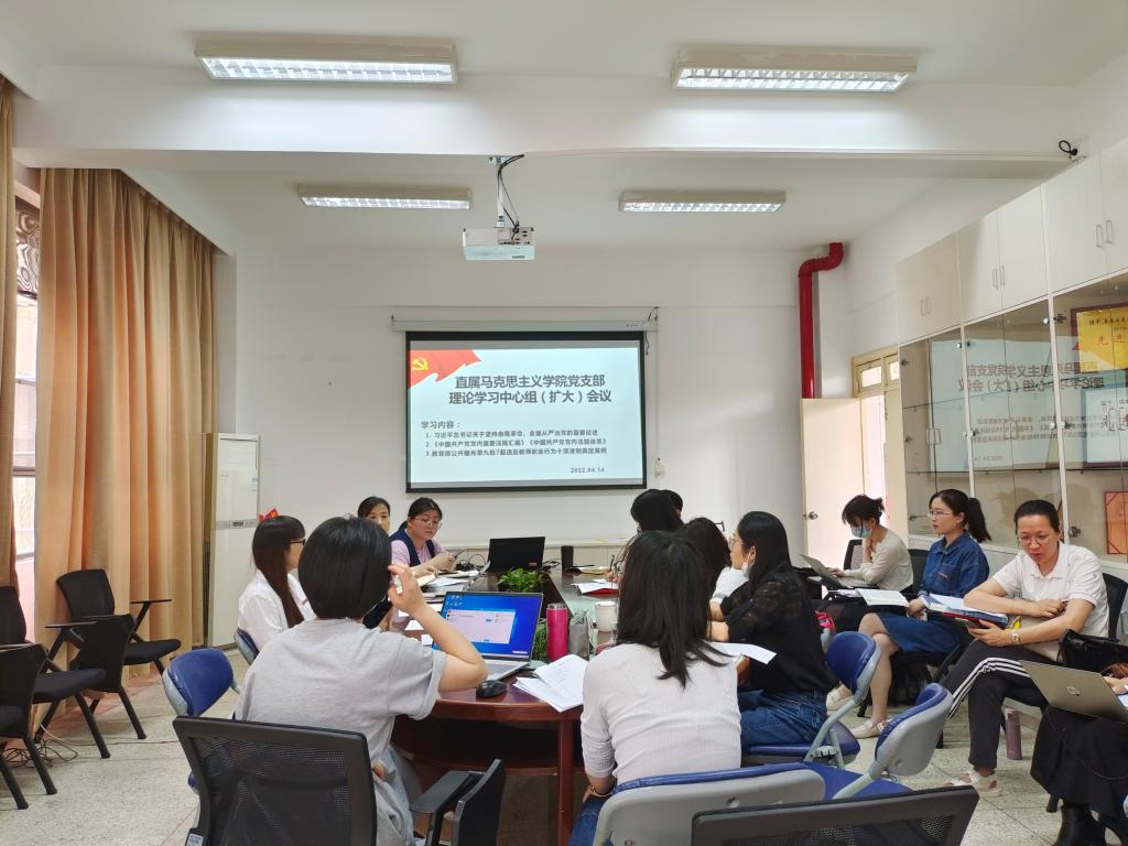 2022年4月14日上午,直屬馬克思主義學院黨支部在107會議室召開中心組學習(擴大)會議,學習《習近平總書記關于堅持自我革命、全面從嚴治黨的重要論述》《中國共產(chǎn)黨黨內(nèi)重要法規(guī)匯編》《中國共產(chǎn)黨黨內(nèi)法規(guī)體系》《教育部公開曝光第九批7起違反教師職業(yè)行為十項準則典型案例》《打“虎”不歇,防疫不力被問責》等內(nèi)容。本次會議由直屬馬克思主義學院黨支部副書記來朋珍主持。
