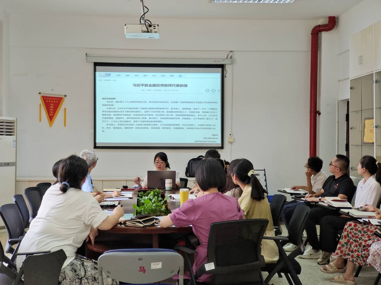 首先,全體黨員集體學習了《習近平總書記教育重要論述講義》,領(lǐng)會教育是立德樹人的事業(yè),“國無德不興,人無德不立”的重要意義。吳薇同志領(lǐng)讀了“習近平總書記致全國優(yōu)秀教師代表的信”,大家倍感振奮、深受鼓舞,也信心滿懷、干勁十足。