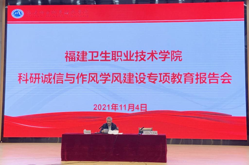 為進一步弘揚求真務實的學術精神,營造風清氣正的良好科研生態(tài),2021年11月4日,我校在學術報告廳舉辦科研誠信與作風學風建設專項教育報告會。本次報告會邀請福建省誠信促進會黨委副書記林鴻堅、福建省誠信促進會副會長黃開良來校講座。校長許能鋒、黨委副書記李美華、紀委書記游鋒、副校長鄭翠紅、全體中層干部、專業(yè)帶頭人、教研室主任、各院系教師代表參會,會議由鄭翠紅主持。