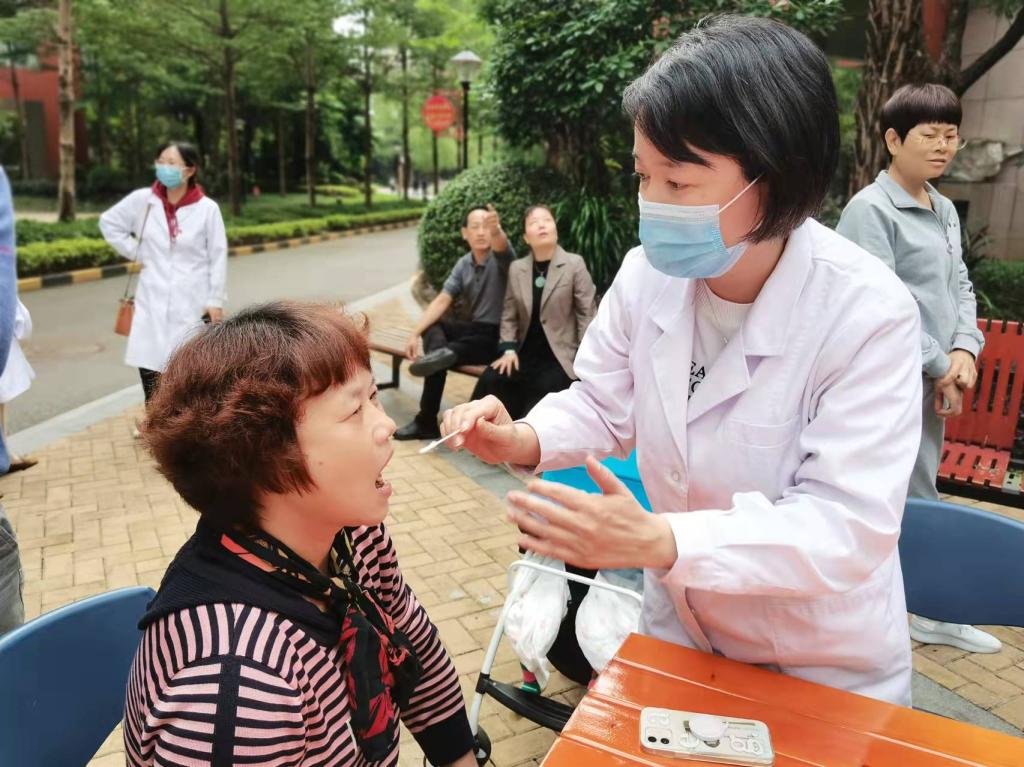 口腔醫(yī)學專業(yè)的老師們?yōu)樯鐓^(qū)居民特別是小朋友們開展口腔健康檢查,為家長科普替牙期的常見口腔問題處理方法,并結合牙齒模型示范正確的刷牙方式,指導居民學習愛牙護牙的口腔健康知識。