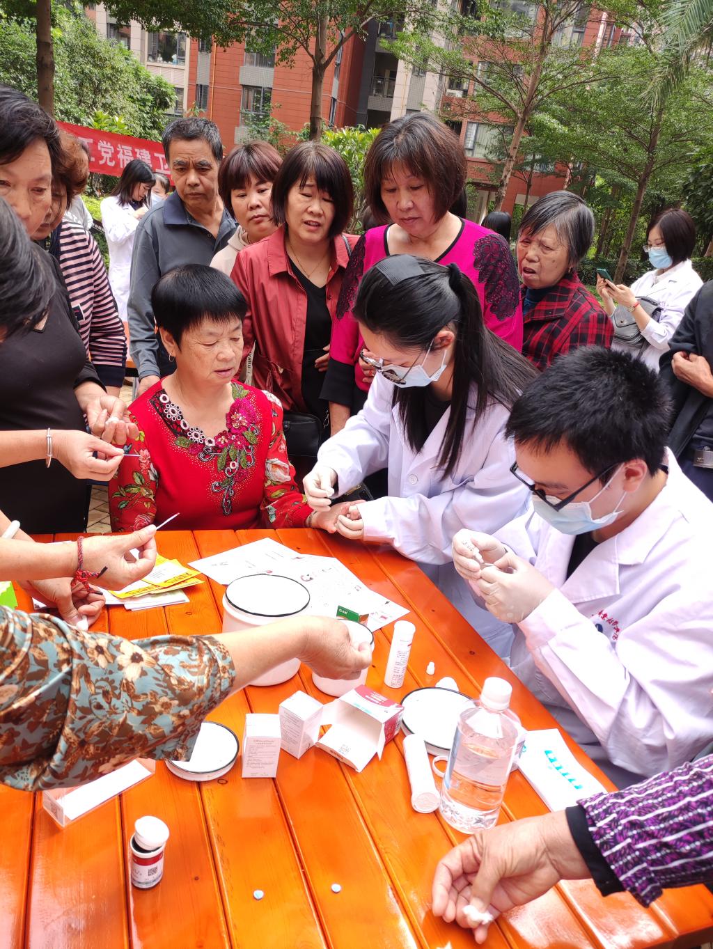 醫(yī)學檢驗技術專業(yè)的師生為社區(qū)居民提供了乙肝表面抗原測定、血糖測定、血型鑒定等服務,并現(xiàn)場科普血型常識,引導居民學習愛肝護肝和防治糖尿病的健康知識。