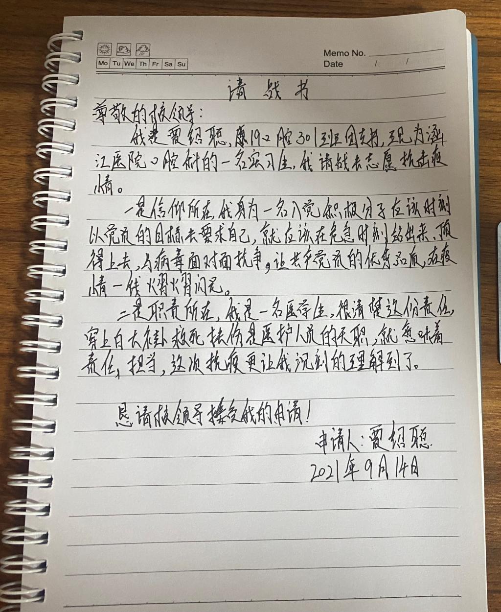作為兩委干部,在校期間帶領(lǐng)著青年志愿者們走進(jìn)社區(qū)、福利院、養(yǎng)老院參加各項(xiàng)公益服務(wù),在疫情面前,毅然沖鋒在前,駐守在安溪縣城廂鎮(zhèn)仙苑村第五小學(xué)臨時(shí)核酸采樣點(diǎn),將志愿服務(wù)進(jìn)行到底?!白鹁吹念I(lǐng)導(dǎo)、老師,作為一名醫(yī)學(xué)生,更是一名入黨積極分子,我將不畏艱險(xiǎn)、迎難而上,為抗御病毒肆虐貢獻(xiàn)全部智慧和力量!”
