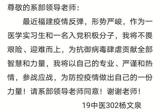 9月10日以來(lái),新冠疫情突襲福建,三十余名醫(yī)學(xué)系實(shí)習(xí)生請(qǐng)?jiān)副几啊耙摺本€,他們當(dāng)中閃耀著這樣一群可愛(ài)的身影,他們不是黨員,卻和黨員一樣敢于擔(dān)當(dāng)、沖鋒在前,用實(shí)際行動(dòng)踐行著初心使命,用無(wú)私無(wú)畏表明入黨的決心,向黨組織作最深刻的思想?yún)R報(bào)。他們就是醫(yī)學(xué)系入黨積極分子們。