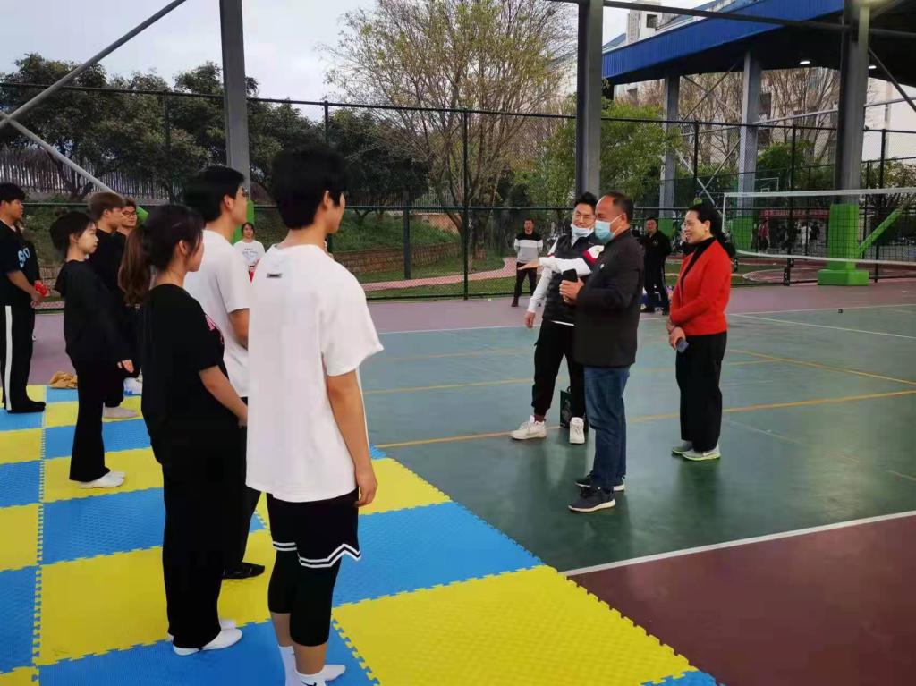 3月29日下午,校長(zhǎng)許能鋒,副校長(zhǎng)、校體委主任鄭翠紅來(lái)到田徑運(yùn)動(dòng)場(chǎng),與正在訓(xùn)練中的啦啦操運(yùn)動(dòng)隊(duì)親切交流。