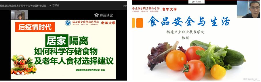 民以食為天,食以安為先。我校健康管理系吳晶和林麒兩位老師分別以《居家隔離如何科學(xué)存儲食物及老年人食材選擇建議》和《看不見的風(fēng)險——談食品安全與生活》為題,揭開日常生活飲食安全風(fēng)險面紗,引導(dǎo)老年人科學(xué)存儲食物、科學(xué)選擇食材、科學(xué)健康飲食,普及食品安全知識,守住舌尖上的安全。