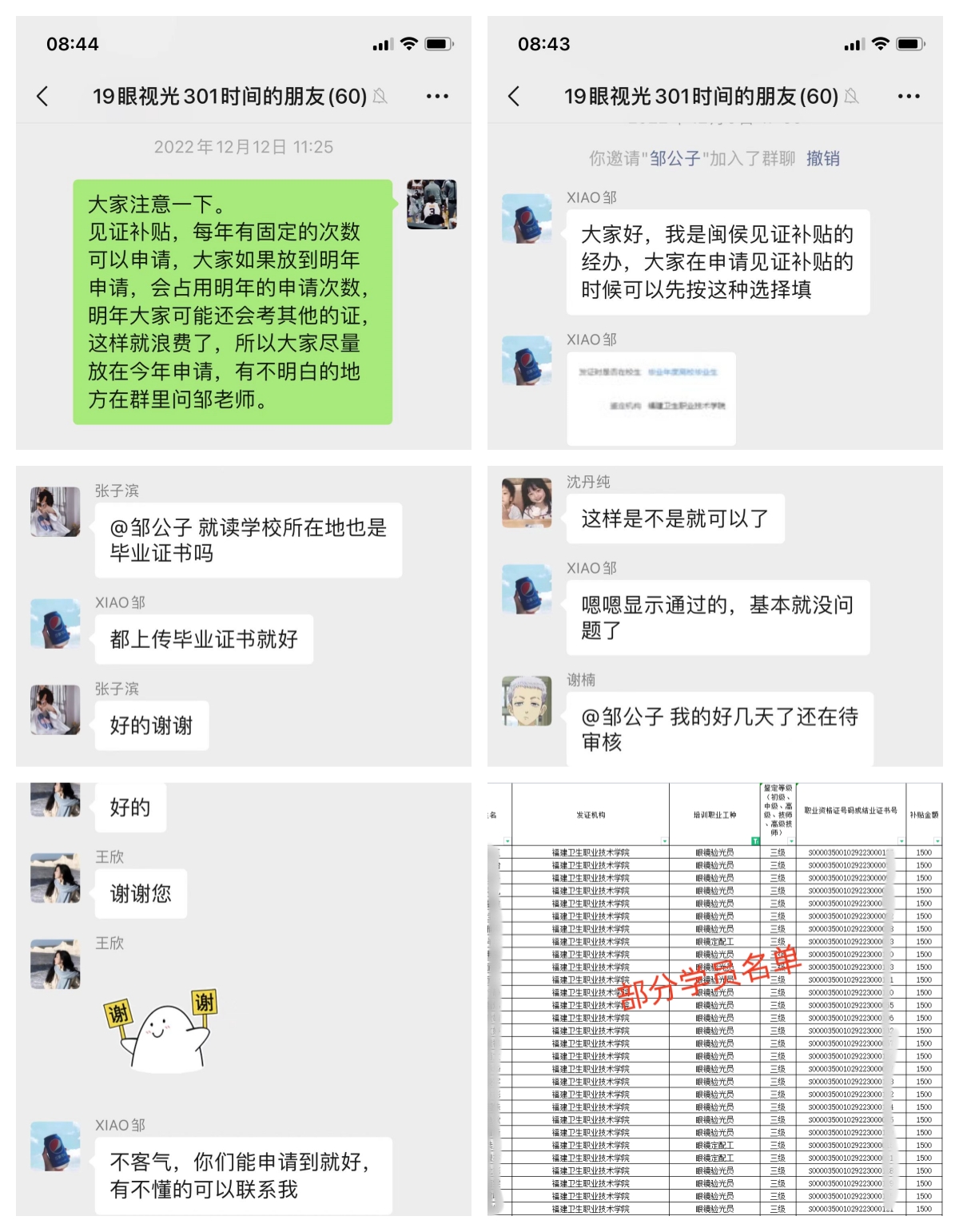 據(jù)悉,以往應(yīng)屆畢業(yè)生“見證補(bǔ)貼”資金申領(lǐng)需前往戶籍所在地人社局申請,且各地補(bǔ)貼資金申領(lǐng)政策差異較大、申請程序繁瑣等原因大大降低了學(xué)生的申請意愿。我校在了解情況后,由繼續(xù)教育學(xué)院聯(lián)合醫(yī)學(xué)技術(shù)系成立眼視光專業(yè)學(xué)生“見證補(bǔ)貼”工作專班,創(chuàng)建微信服務(wù)工作群,并邀請閩侯縣人社局審核專員入群指導(dǎo)。針對學(xué)生提出的各項(xiàng)問題閩侯縣人社局給予了悉心指導(dǎo),解決學(xué)生在證書補(bǔ)貼申領(lǐng)流程上的諸多疑問,大大提升了申領(lǐng)效率,打通證書補(bǔ)貼資金申領(lǐng)“最后一公里”。截至目前,我校共有126名學(xué)生成功申領(lǐng)補(bǔ)貼,三級證書(高級)每人可領(lǐng)取補(bǔ)貼1500元,合計(jì)補(bǔ)助金額189000元。