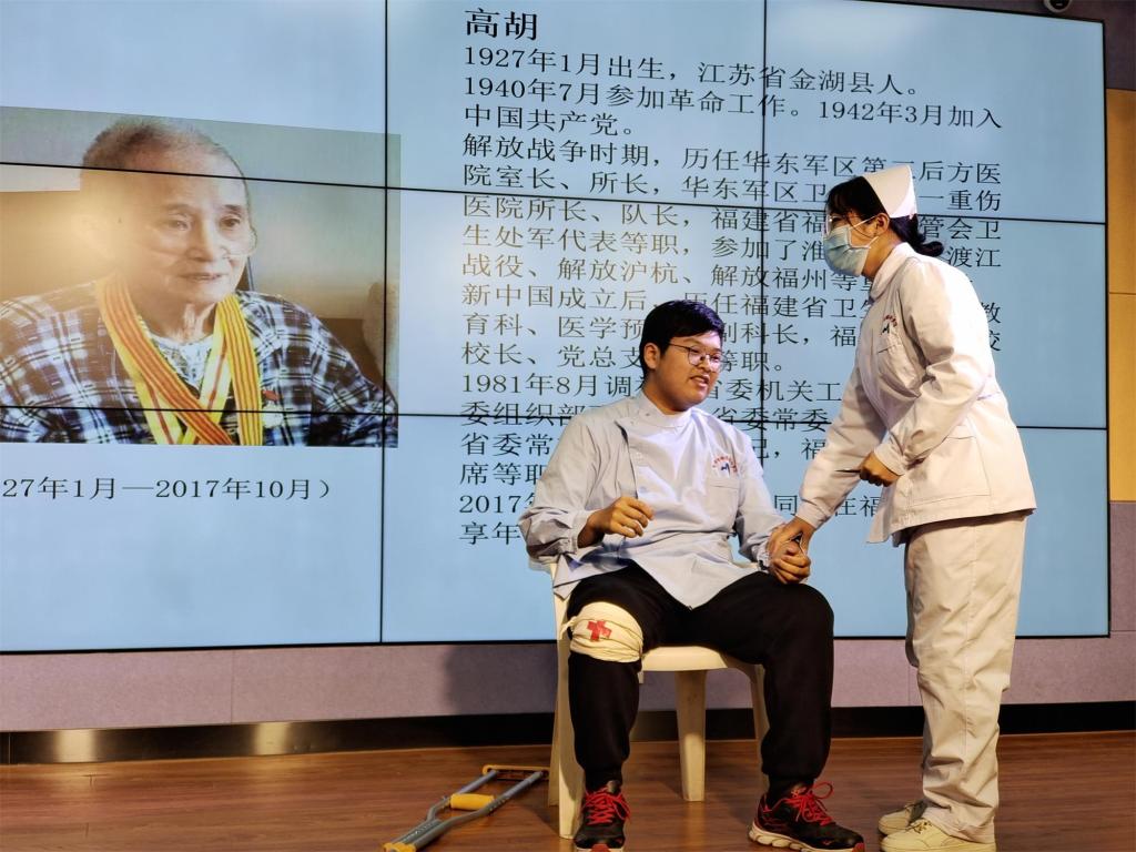 《傅連暲從教會(huì)醫(yī)生到革命者的轉(zhuǎn)變》《沖破封鎖,保障藥械供應(yīng)》《華東醫(yī)務(wù)工作者的旗幟》《月亮洞醫(yī)院》《德醫(yī)雙馨的醫(yī)務(wù)工作者》《閩衛(wèi)的軍營(yíng)生活——我的人生起點(diǎn)》《“生命天使”林巧稚》《吳孟超:披肝瀝膽,醫(yī)者仁心》等情景劇作品,分別講述了傅連暲、曹國(guó)煌、高胡、陳海峰、左英、陶平、林巧稚、吳孟超等紅色閩醫(yī)故事,以飽含年代感的場(chǎng)景、內(nèi)涵豐富的情節(jié)展示了革命戰(zhàn)爭(zhēng)年代、新中國(guó)成立前后到中國(guó)特色社會(huì)主義新時(shí)代的醫(yī)療戰(zhàn)線上英雄人物的光輝事跡以及一代代福建紅醫(yī)人傳承“政治堅(jiān)定、救死扶傷、埋頭骨干、技術(shù)優(yōu)良”為主要內(nèi)容的紅醫(yī)精神。同學(xué)們生動(dòng)逼真的表演感染了在場(chǎng)所有人,把師生們帶回到激情燃燒的歲月,大家紛紛表示,通過(guò)親身演繹紅醫(yī)故事,更加深刻地體會(huì)到紅醫(yī)前輩的不易,更加強(qiáng)烈地感受到醫(yī)學(xué)生的初心與使命,也更加明白了作為當(dāng)代醫(yī)學(xué)生要賡續(xù)紅醫(yī)精神,樹(shù)立崇高信念,練就過(guò)硬本領(lǐng),無(wú)愧新時(shí)代閩衛(wèi)人的責(zé)任與擔(dān)當(dāng)。
