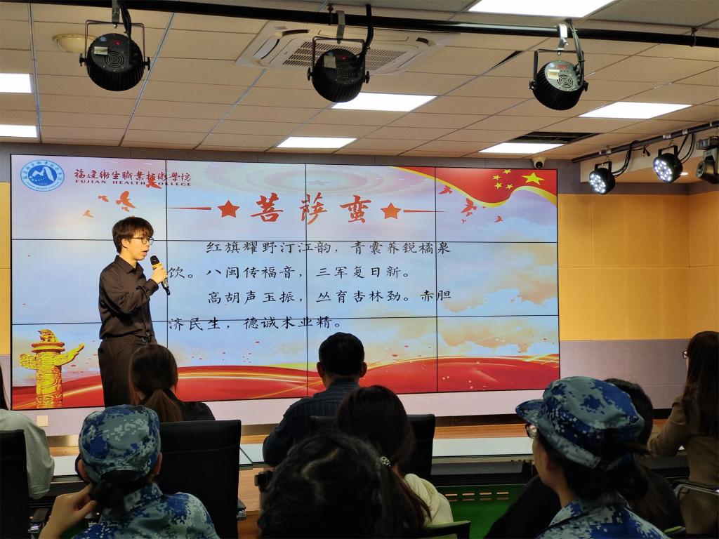 “紅旗耀野汀江韻,青囊養(yǎng)銳橘泉飲。八閩傳福音,三軍復(fù)日新。高胡聲玉振,叢育杏林勁。赤膽濟(jì)民生,德誠(chéng)術(shù)業(yè)精?!眮?lái)自閩南地區(qū)的學(xué)子用富有壓韻與節(jié)奏之美的閩南話聲情并茂地朗誦原創(chuàng)詩(shī)《菩薩蠻》,該詩(shī)敘述了“紅色華佗”傅連暲等閩西革命子弟兵的英雄事跡,講述了福音醫(yī)院從閩西遷往江西成立中央紅軍醫(yī)院的崢嶸故事。冒著槍林彈雨救治傷員,醫(yī)治窮苦百姓,這種無(wú)畏生死、救死扶傷的精神使同學(xué)們無(wú)不動(dòng)容,不僅展示了對(duì)紅醫(yī)前輩的敬仰,更表達(dá)了傳承紅醫(yī)精神、在醫(yī)學(xué)探索中砥礪前行的決心。