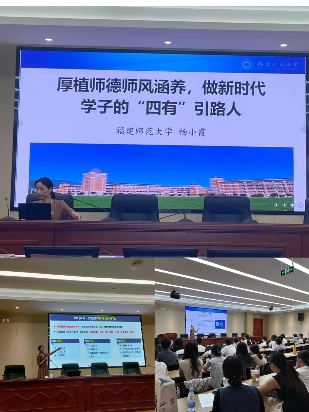 福建師范大學楊小霞教授則圍繞“師德師風”為新入職教職工作題為《厚植師風師德涵養(yǎng),做新時代學子的“四有”引路人》專題講座。講座中,楊小霞教授提出,教書育人,教書者必先學為人師,育人者必先行為世范,并引用習近平總書記的重要講話,勉勵老師要做學生錘煉品格的引路人,學生學習知識的引路人,學生創(chuàng)新思維的引路人,學生奉獻祖國的引路人。她激勵教師們要提高自我思想修養(yǎng),自覺遵守學校的規(guī)章制度和有關(guān)規(guī)定,以身作則,潔身自好,以德服人,以身立教,為學生樹立起楷模的形象,做一名合格的新時代教師。