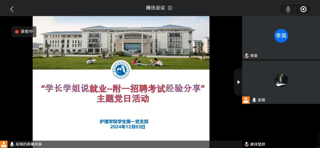 為深入貫徹落實(shí)黨的二十屆三中全會(huì)精神和習(xí)近平總書記關(guān)于促進(jìn)高質(zhì)量充分就業(yè)的重要講話精神,12月3日,護(hù)理學(xué)院學(xué)生第一黨支部開展“學(xué)長(zhǎng)學(xué)姐說就業(yè)——附一專場(chǎng)招聘考試經(jīng)驗(yàn)交流分享”主題黨日活動(dòng)。本次促就業(yè)分享會(huì)邀請(qǐng)就職于福建醫(yī)科大學(xué)附屬第一醫(yī)院的2024屆畢業(yè)生李涵和林栩,為即將參加招聘考試的2025屆畢業(yè)生提供實(shí)用的求職技巧和經(jīng)驗(yàn),提高就業(yè)競(jìng)爭(zhēng)力。