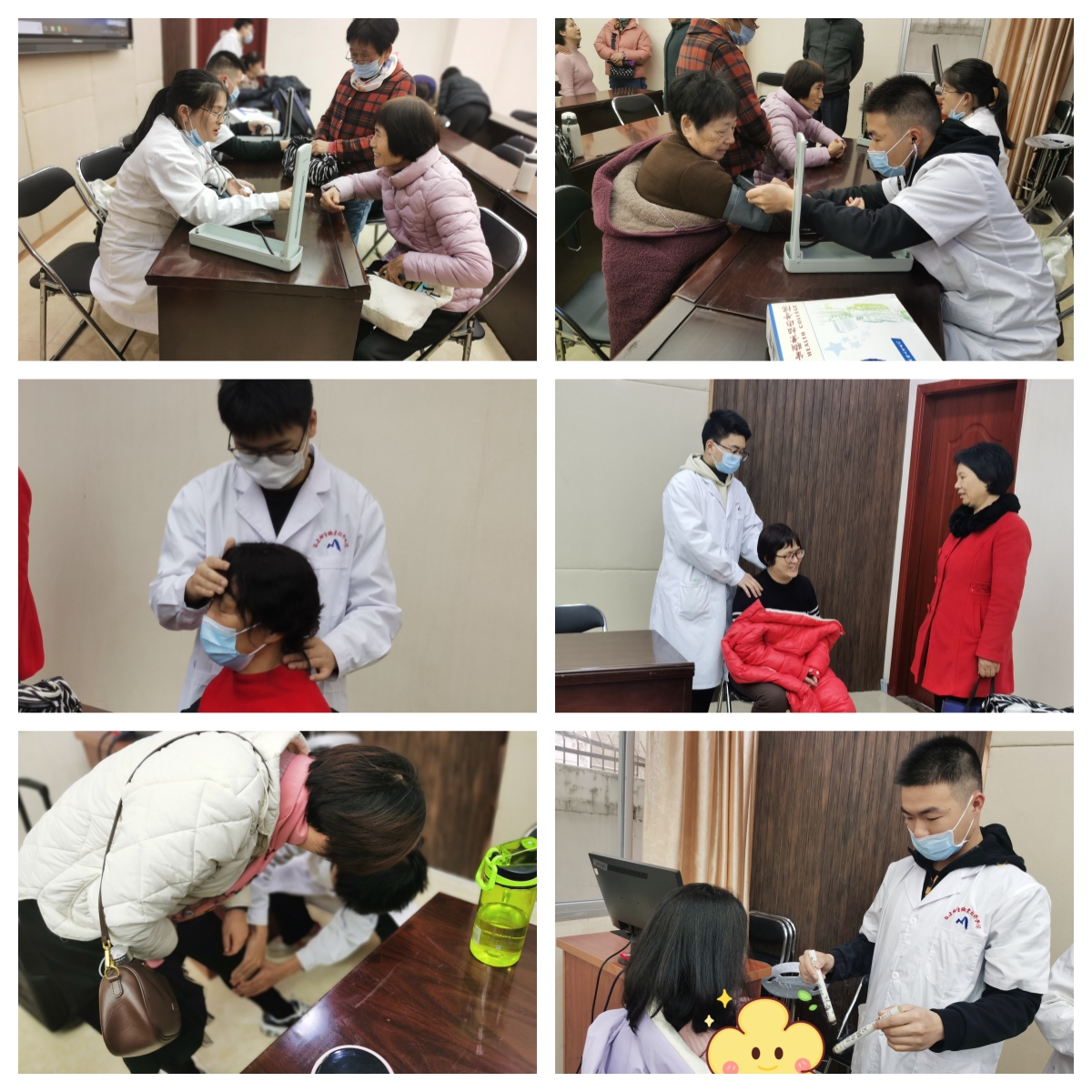 講座結(jié)束后,由醫(yī)學(xué)院學(xué)生組成的義診團(tuán)隊(duì)迅速投入工作。他們?yōu)槔夏昱詫W(xué)員們進(jìn)行了血壓、血糖測(cè)量,心肺功能聽(tīng)診等基礎(chǔ)健康檢查,并根據(jù)檢查結(jié)果提供個(gè)性化的健康建議,同時(shí)針對(duì)部分老年學(xué)員的脊柱亞健康等問(wèn)題進(jìn)行手法松解、艾灸推拿。同學(xué)們認(rèn)真細(xì)致的服務(wù)態(tài)度,讓老年學(xué)員們感受到了濃濃的關(guān)懷。