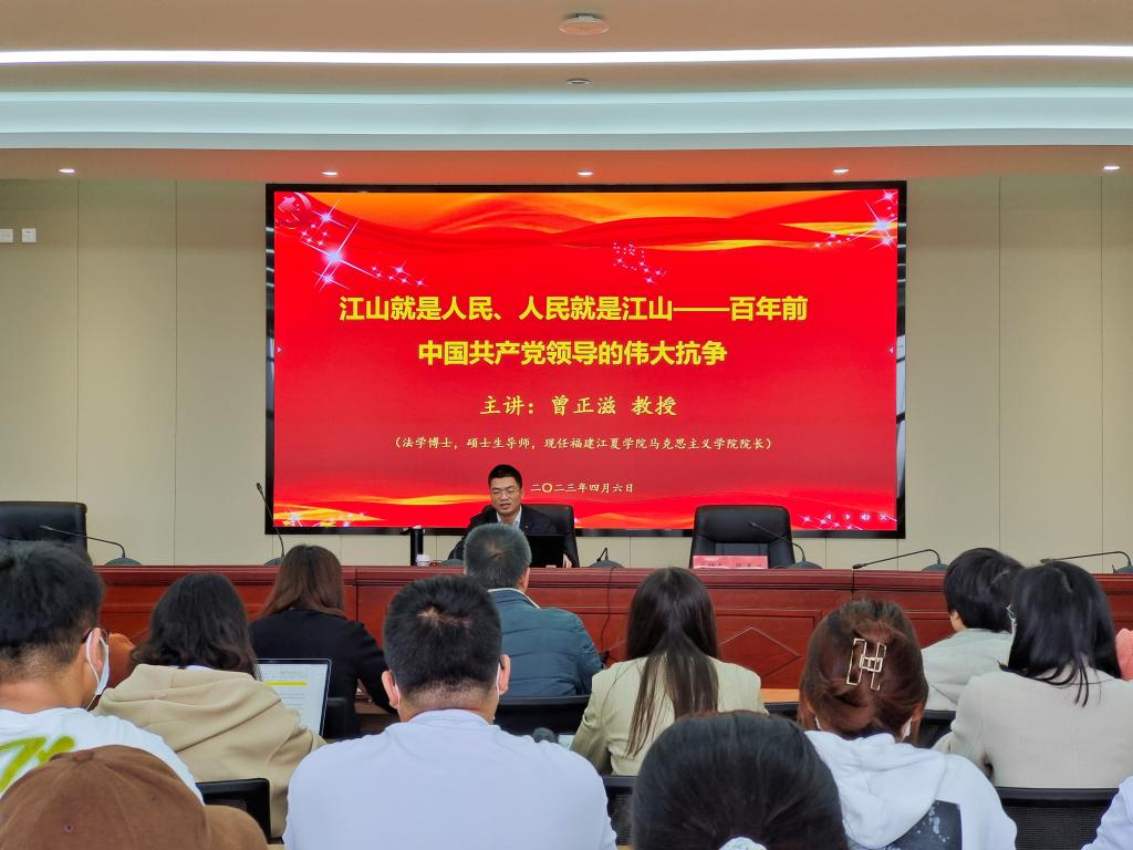 為幫助我校師生堅(jiān)持不懈用習(xí)近平新時(shí)代中國特色社會(huì)主義思想和黨的二十大精神凝心鑄魂,進(jìn)一步學(xué)習(xí)黨的百年奮斗重大成就和歷史經(jīng)驗(yàn),落實(shí)省委“深學(xué)爭優(yōu)、敢為爭先、實(shí)干爭效”行動(dòng)部署,2023年4月6日,我校邀請(qǐng)福建江夏學(xué)院馬克思主義學(xué)院院長曾正滋教授在行政樓六樓會(huì)議室作題為《江山就是人民、人民就是江山——百年前中國共產(chǎn)黨領(lǐng)導(dǎo)的偉大抗?fàn)帯穼n}講座。中層干部代表、思政課教師、“青馬工程”學(xué)員及習(xí)近平新時(shí)代中國特色社會(huì)主義思想讀書社學(xué)生參加講座,講座由馬克思主義學(xué)院院長熊美蘭主持。