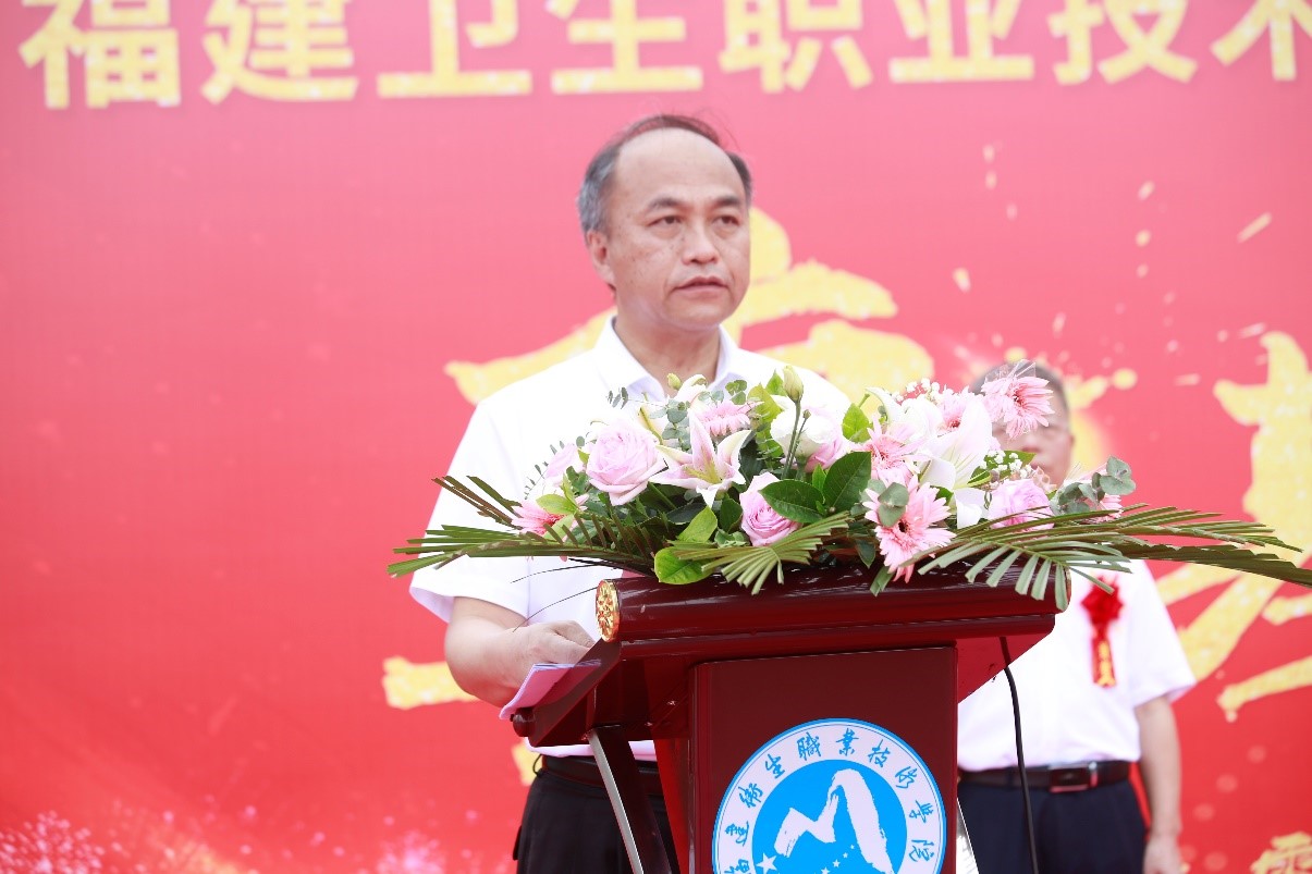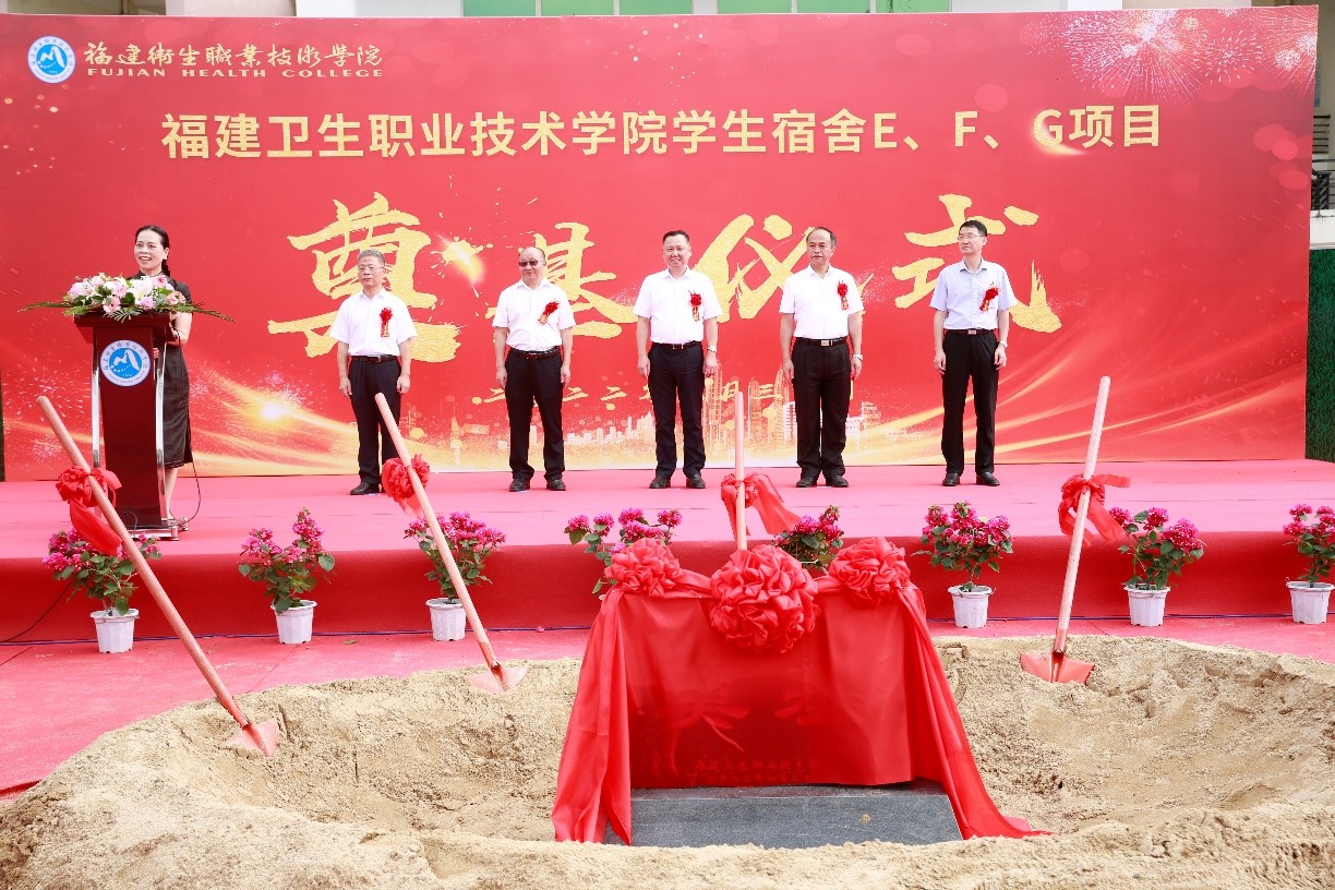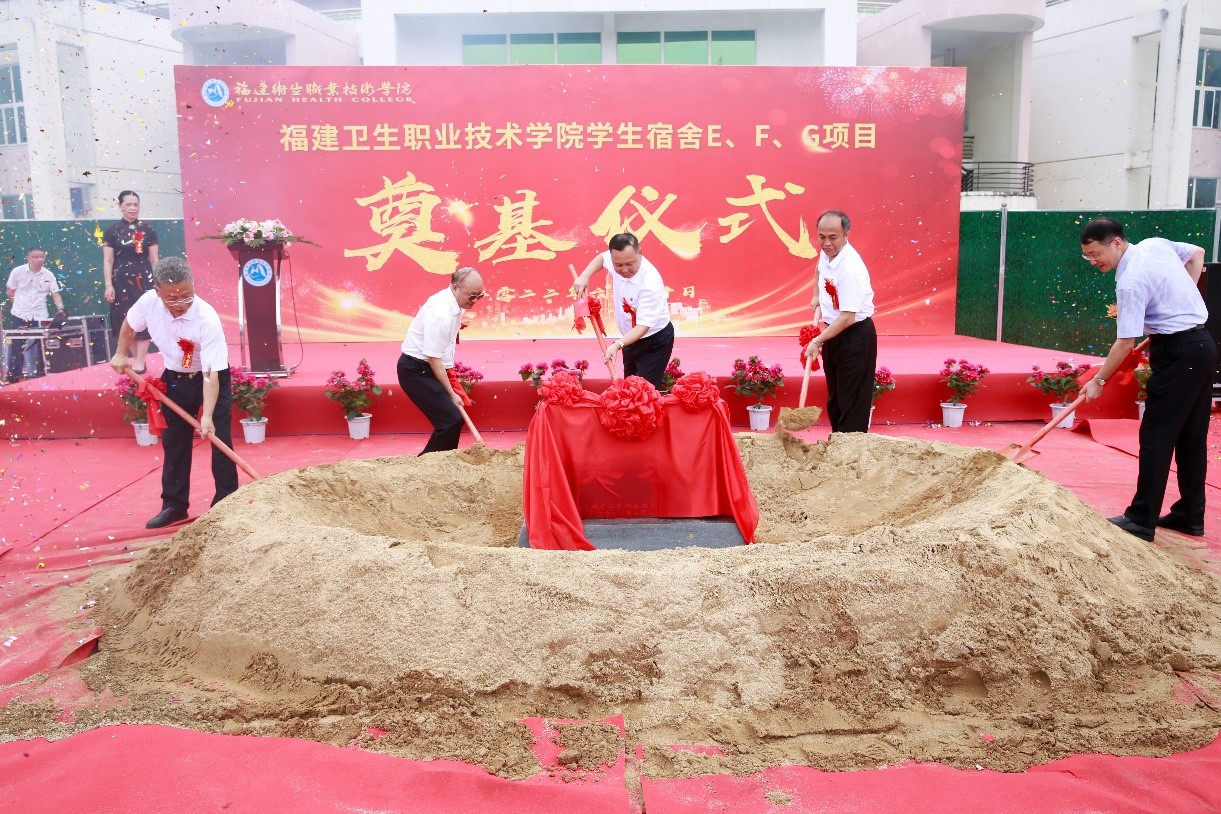 隨后,領(lǐng)導(dǎo)、嘉賓共同為福建衛(wèi)生職業(yè)技術(shù)學(xué)院學(xué)生宿舍EFG樓項(xiàng)目工程培土奠基。