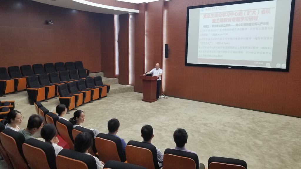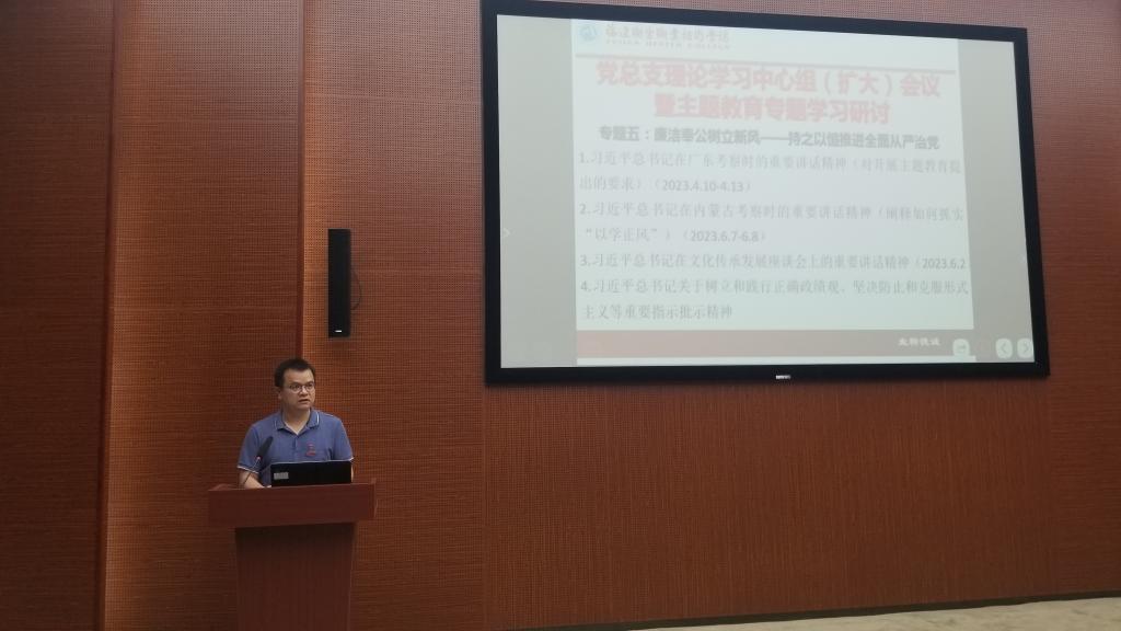 參觀結(jié)束后,全體中心組成員在博物館多功能廳召開(kāi)黨總支理論學(xué)習(xí)中心組(擴(kuò)大)會(huì)議暨主題教育專(zhuān)題學(xué)習(xí)研討,醫(yī)學(xué)院黨總支書(shū)記邱滾忠主持會(huì)議。與會(huì)人員圍繞主題教育專(zhuān)題五:廉潔奉公樹(shù)立新風(fēng)——持之以恒推進(jìn)全面從嚴(yán)治黨進(jìn)行集中學(xué)習(xí)研討。醫(yī)學(xué)院副院長(zhǎng)鄧元榮、副書(shū)記陳潔結(jié)合專(zhuān)題學(xué)習(xí)進(jìn)行交流分享。
