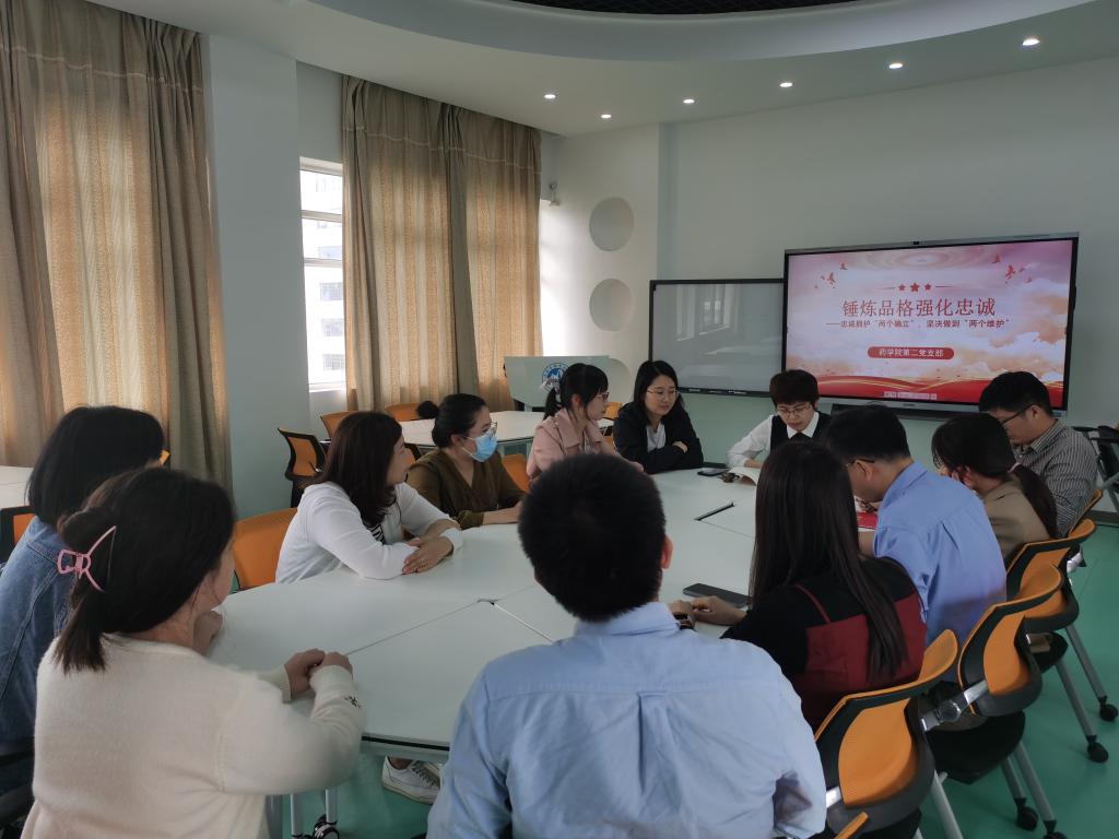 為深入學(xué)習(xí)領(lǐng)會習(xí)近平新時(shí)代中國特色社會主義思想,忠誠擁護(hù)“兩個確立”,堅(jiān)決做到“兩個維護(hù)”,藥學(xué)院第二黨支部于2023年5月11日開展“錘煉品格強(qiáng)化忠誠”專題學(xué)習(xí)。本次專題學(xué)習(xí)由支部書記劉丹丹主持。