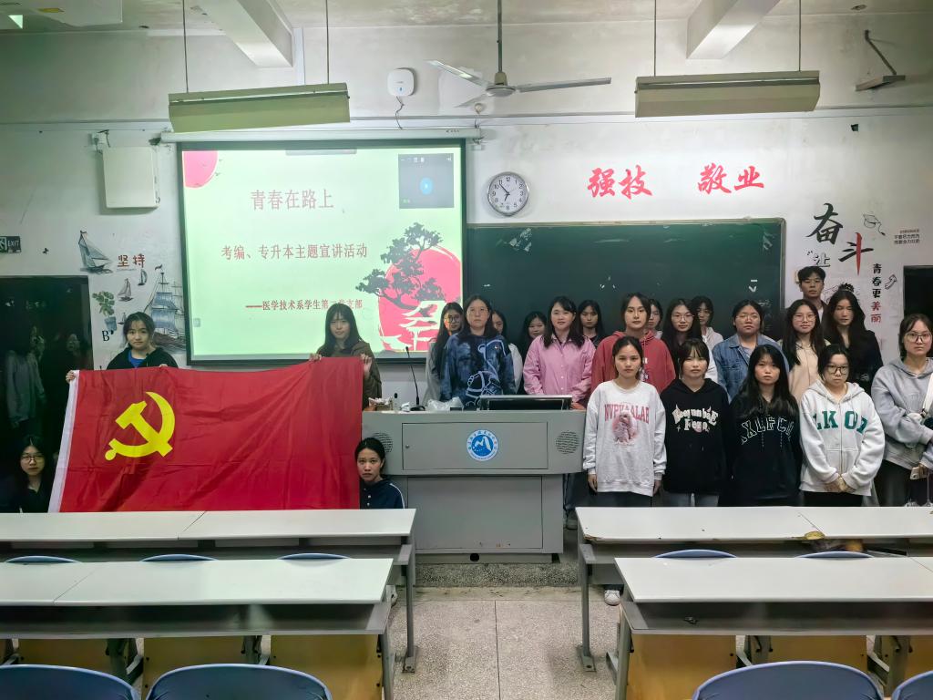 為進(jìn)一步促進(jìn)優(yōu)良學(xué)風(fēng),營(yíng)造良好的學(xué)習(xí)氛圍。幫助同學(xué)們加深對(duì)就業(yè)前景的認(rèn)識(shí),充分交流專(zhuān)升本考試的經(jīng)驗(yàn),以便學(xué)生們做好未來(lái)的學(xué)習(xí)規(guī)劃和掌握備考技巧。2023年11月12日晚,醫(yī)學(xué)技術(shù)系學(xué)生第二黨支部在醫(yī)學(xué)技術(shù)系第一階梯教室舉辦了青春在路上——醫(yī)學(xué)技術(shù)系學(xué)生第二黨支部考編、專(zhuān)升本宣講會(huì)。為方便在校生與實(shí)習(xí)生參與宣講會(huì),會(huì)議通過(guò)線(xiàn)上線(xiàn)下結(jié)合形式開(kāi)展,邀請(qǐng)優(yōu)秀畢業(yè)生代表石錦淮、張烽、王遠(yuǎn)宏與同學(xué)們分享學(xué)習(xí)備考的經(jīng)驗(yàn)。