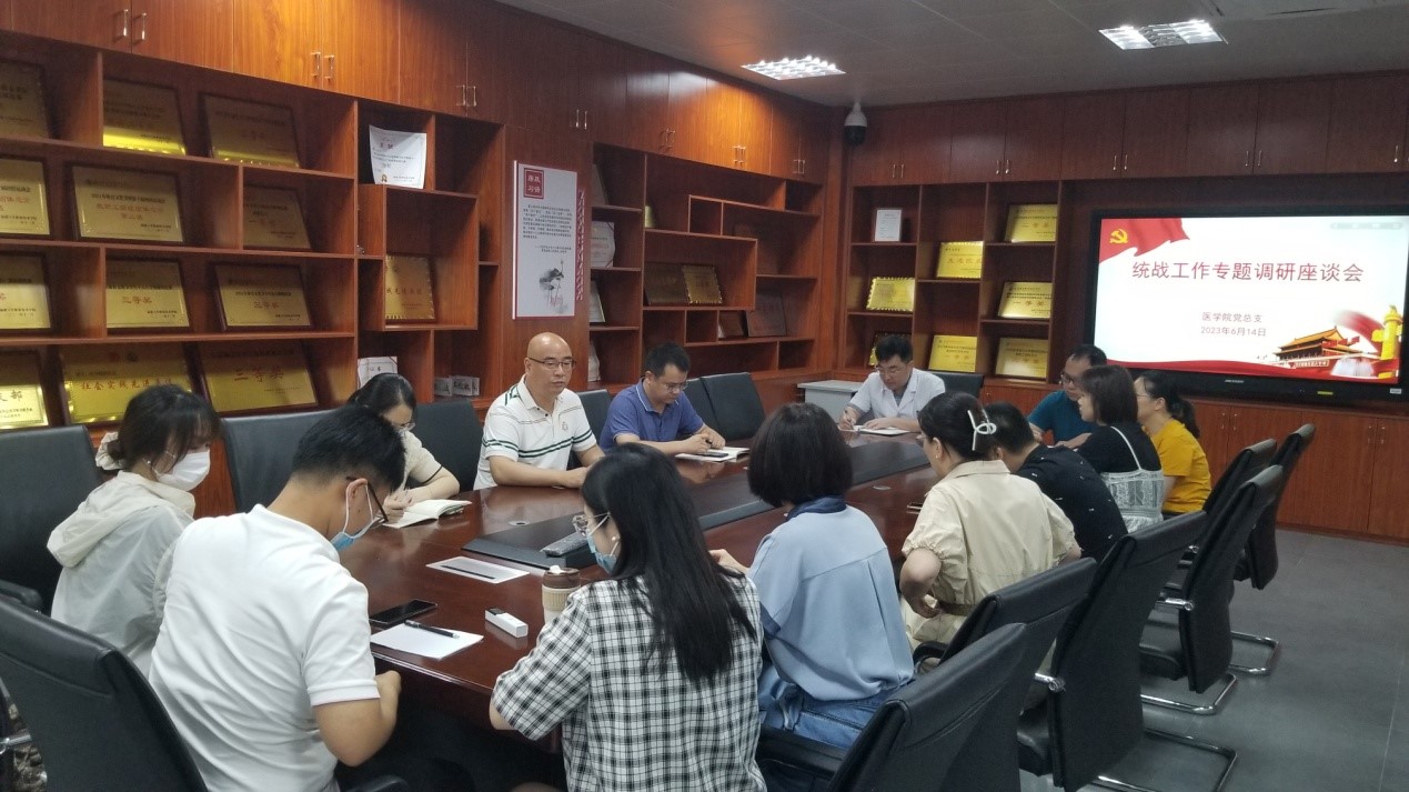 為推進主題教育走深走實,扎實開展調(diào)查研究工作,進一步加強統(tǒng)戰(zhàn)人士思想政治引領(lǐng),6月14日下午,醫(yī)學(xué)院就主題教育相關(guān)要求開展統(tǒng)戰(zhàn)工作專題調(diào)研座談會。會議由黨總支書記邱滾忠主持,黨總支及各黨支部統(tǒng)戰(zhàn)委員,學(xué)院各民主黨派教師、黨外教師代表參會。