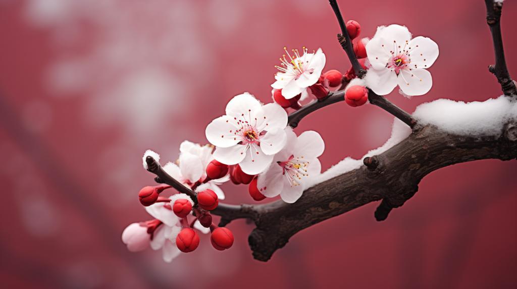 詩的開篇“雪入春分省見稀”,點明時間是春分之后,且強調(diào)此時下雪是比較罕見的現(xiàn)象。春分本應(yīng)是春暖花開、萬物復(fù)蘇的時節(jié),然而一場春雪卻突然降臨,這種意外打破了人們對春日常規(guī)景象的認知,為全詩增添了一份新奇之感?!鞍腴_桃李不勝威”,描繪了半開的桃李花在春雪的侵襲下顯得嬌弱不堪的情景。桃李本是春天的使者,它們帶著春天的希望與生機,卻在這場春雪中受到了考驗。但換個角度看,這也體現(xiàn)出大自然的變幻莫測,即便是在看似溫暖的春天,也會有寒冷的挑戰(zhàn)。