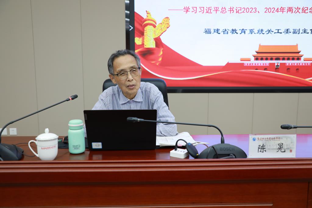為深入學習貫徹習近平新時代中國特色社會主義思想,發(fā)揚紅色傳統(tǒng),傳承紅色基因,引領師生繼續(xù)堅定跟黨走、建功新時代,10月22日,我校關工委邀請福建省教育系統(tǒng)關工委主任陳晃走進學校思政課堂,為校師生代表舉辦紅色精神專題講座,福建省教育系統(tǒng)關工委副秘書長、辦公室主任羅永倩陪同。校關工委主任嚴肅、副主任陳雄出席講座,校關工委、二級學院關工委、學生工作部黨支部、團委負責人、輔導員代表和學生代表共100余人參加講座,講座由副校長、校關工委副主任黃銘珊主持。