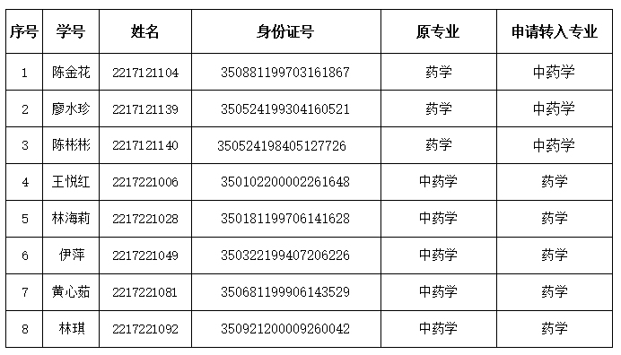 根據(jù)中國藥科大學(xué)繼續(xù)教育學(xué)院相關(guān)管理規(guī)定,2022級陳金花等8人因個人工作需要等原因,提出轉(zhuǎn)專業(yè)申請,經(jīng)班主任審核,我站研究審議,該3名學(xué)生符合轉(zhuǎn)專業(yè)條件,同意轉(zhuǎn)專業(yè),并上報(bào)中國藥科大學(xué)繼續(xù)教育學(xué)院審批。