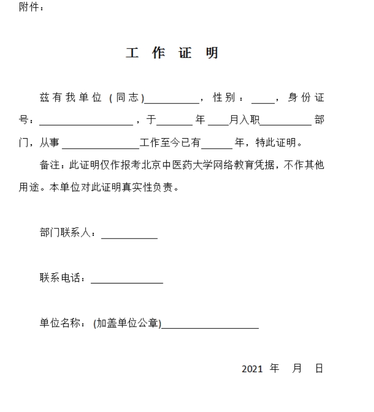 ①網(wǎng)上打印的報(bào)名表(須單位蓋章簽字、學(xué)生簽字)、工作證明(見附件,須單位蓋章)各1份;