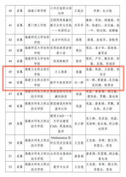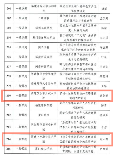 近日,根據(jù)《福建省教育廳關(guān)于公布第三批省終身教育重點項目立項及立項建設(shè)項目驗收結(jié)果的通知》(閩教職成2020〕37號)校老年大學項目獲批《福建省高校老年大學建設(shè)項目》;醫(yī)學系張?zhí)N老師主持的《小兒推拿》項目、護理學院劉一群老師主持的《腦卒中居家照護》項目入選省級繼續(xù)教育網(wǎng)絡(luò)課程;連劍娟老師主持的《農(nóng)村社區(qū)腫瘤防治知識終身教育模式的研究》項目、劉一群老師主持的《腦卒中康復(fù)護理》慕課在社區(qū)老年健康教育中的應(yīng)用研究項目入選終身教育研究課題。特此祝賀!