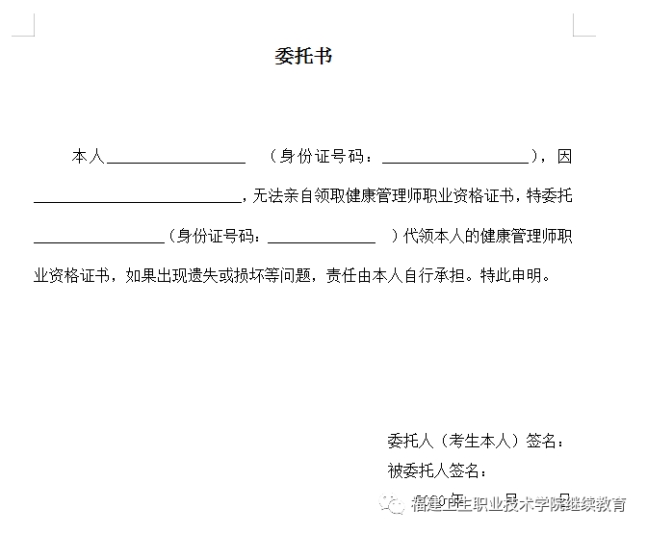 領(lǐng)取方式:本人攜帶身份證原件到福建衛(wèi)生職業(yè)技術(shù)學(xué)院技能鑒定站領(lǐng)取;若需他人代領(lǐng),請(qǐng)代領(lǐng)人攜帶本人身份證原件和復(fù)印件、委托人身份證復(fù)印件以及委托書(shū)(委托書(shū)模板見(jiàn)下),方能領(lǐng)取?! ?/span>