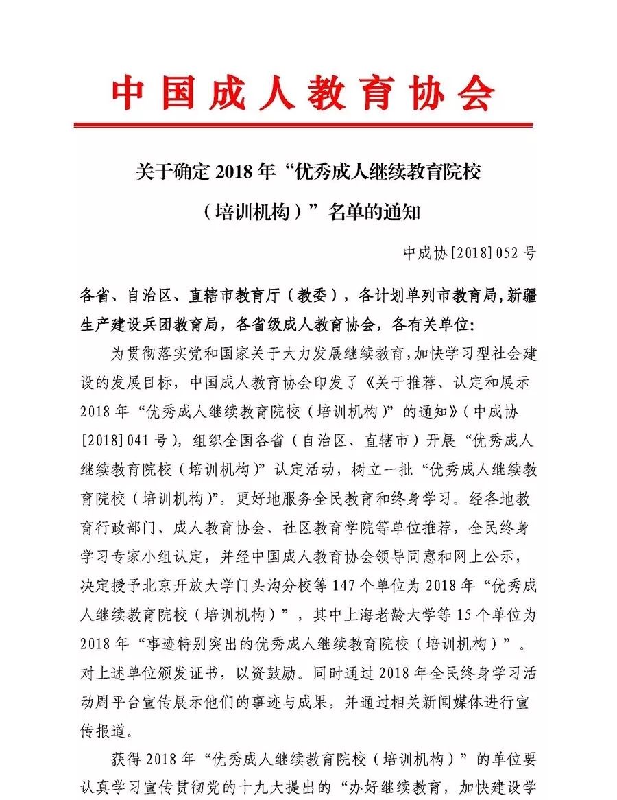 近日,中國成人教育協(xié)會(huì)發(fā)布了《關(guān)于確定2018年“優(yōu)秀成人繼續(xù)教育院校(培訓(xùn)機(jī)構(gòu))”名單的通知》(中成協(xié)〔2018〕052號(hào)),經(jīng)各地教育行政部門、成人教育協(xié)會(huì)、社區(qū)教育學(xué)院等單位推薦,全民終身學(xué)習(xí)專家小組認(rèn)定,全國147個(gè)單位被授予“優(yōu)秀成人繼續(xù)教育院校(培訓(xùn)機(jī)構(gòu))”,我院是福建省三個(gè)入選單位中唯一一所高職高專院校。