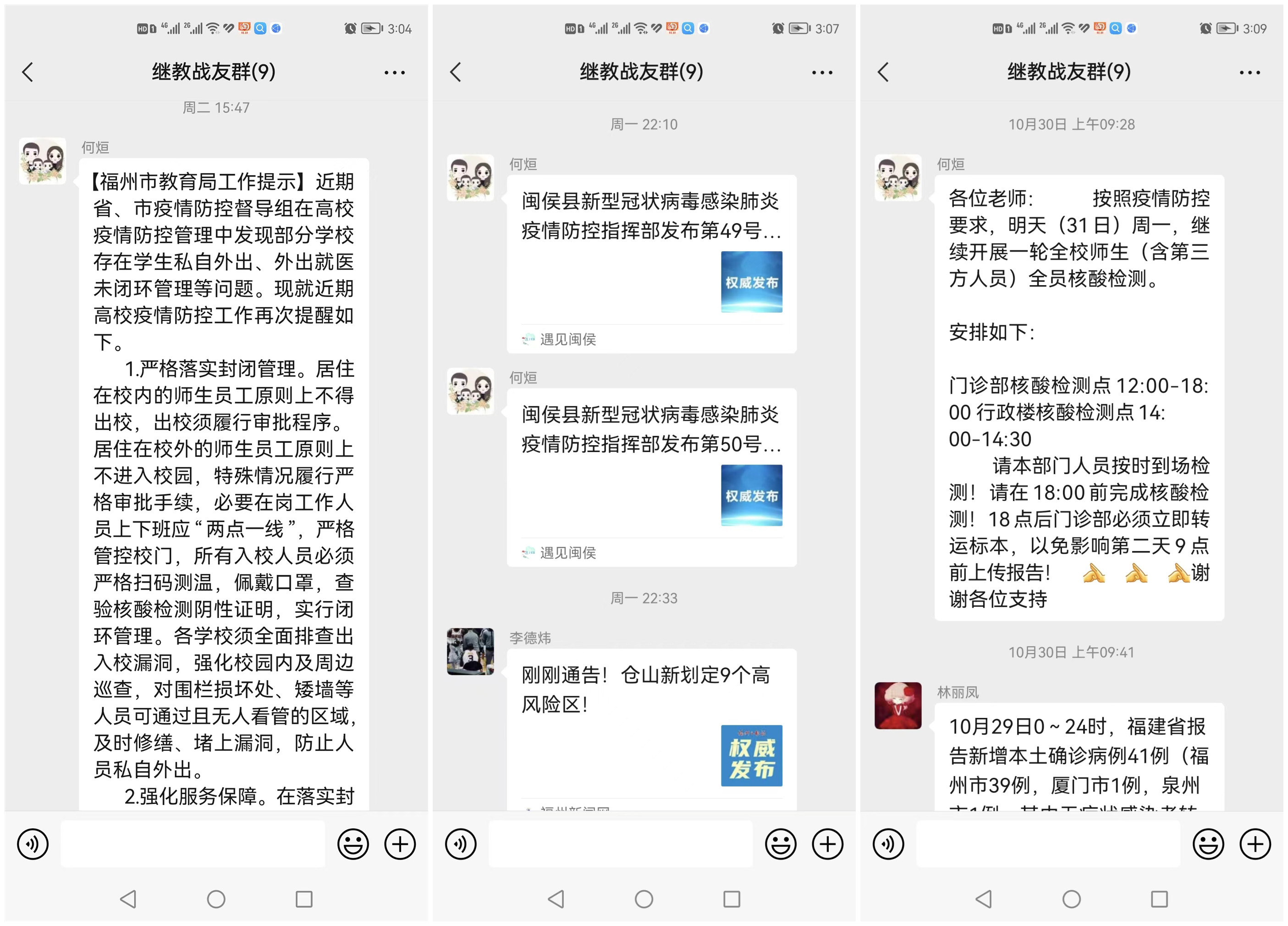 近期,福州市多地相繼突發(fā)疫情,繼續(xù)教育學(xué)院黨支部全體黨員、入黨積極分子積極響應(yīng)黨的號召,充分發(fā)揮黨支部戰(zhàn)斗堡壘作用,發(fā)揚(yáng)黨員的先鋒模范作用,在疫情防控中見行動、作表率、作貢獻(xiàn)。
