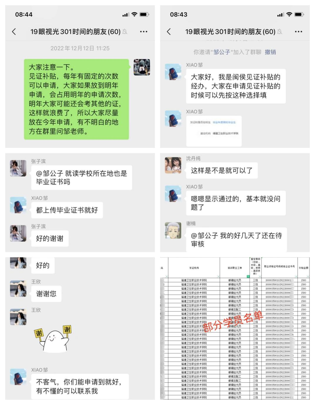 據(jù)悉,以往應(yīng)屆畢業(yè)生“見證補(bǔ)貼”資金申領(lǐng)需前往戶籍所在地人社局申請。且各地補(bǔ)貼資金申領(lǐng)政策差異較大、申請程序繁瑣等原因大大降低了學(xué)生的申請意愿。繼續(xù)教育學(xué)院在了解情況后,迅速組建黨員志愿服務(wù)隊,聯(lián)合醫(yī)學(xué)技術(shù)系成立眼視光專業(yè)學(xué)生“見證補(bǔ)貼”工作專班,創(chuàng)建微信服務(wù)工作群,并邀請閩侯縣人社局審核專員入群指導(dǎo)。針對學(xué)生提出的各項問題給予了悉心指導(dǎo),解決學(xué)生在證書補(bǔ)貼申領(lǐng)流程上的諸多疑問,大大提升了申領(lǐng)效率,打通證書補(bǔ)貼資金申領(lǐng)“最后一公里”。截至目前,我校共有126名學(xué)生成功申領(lǐng)補(bǔ)貼,三級證書(高級)每人可領(lǐng)取補(bǔ)貼1500元,合計補(bǔ)助金額189000元。
