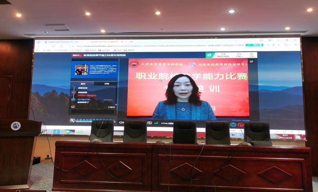 為貫徹落實(shí)全國職業(yè)教育大會精神和《國家職業(yè)教育改革實(shí)施方案》,更好地備戰(zhàn)2021年教師教學(xué)能力大賽,并將教學(xué)能力比賽的成果應(yīng)用到實(shí)際教學(xué)中,以切實(shí)提升教學(xué)能力水平,4月25日,我校教務(wù)處組織全校教師在實(shí)訓(xùn)樓四樓報(bào)告廳觀看由天津醫(yī)學(xué)高等??茖W(xué)校和全國高校教師網(wǎng)絡(luò)培訓(xùn)中心共同舉辦的“職業(yè)院校教學(xué)能力比賽專項(xiàng)培訓(xùn)”直播。