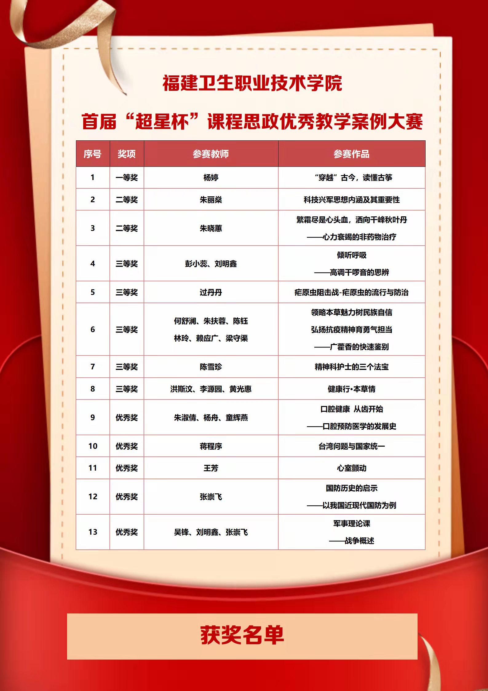2021年9月,首屆“超星杯”全國(guó)職業(yè)院校課程思政優(yōu)秀教學(xué)案例大賽開賽,本次大賽共收到143所職業(yè)院校600多個(gè)教學(xué)團(tuán)隊(duì)的作品,設(shè)一等獎(jiǎng)6項(xiàng)、二等獎(jiǎng)16項(xiàng)、三等獎(jiǎng)30項(xiàng)、優(yōu)秀獎(jiǎng)60項(xiàng),獲獎(jiǎng)率不到19%。經(jīng)過激烈角逐,我校教學(xué)團(tuán)隊(duì)斬獲一等獎(jiǎng)1項(xiàng),二等獎(jiǎng)2項(xiàng),三等獎(jiǎng)5項(xiàng),優(yōu)秀獎(jiǎng)5項(xiàng),獲獎(jiǎng)數(shù)目占總獲獎(jiǎng)數(shù)的12%,成為本次大賽獲獎(jiǎng)數(shù)最多的學(xué)校。