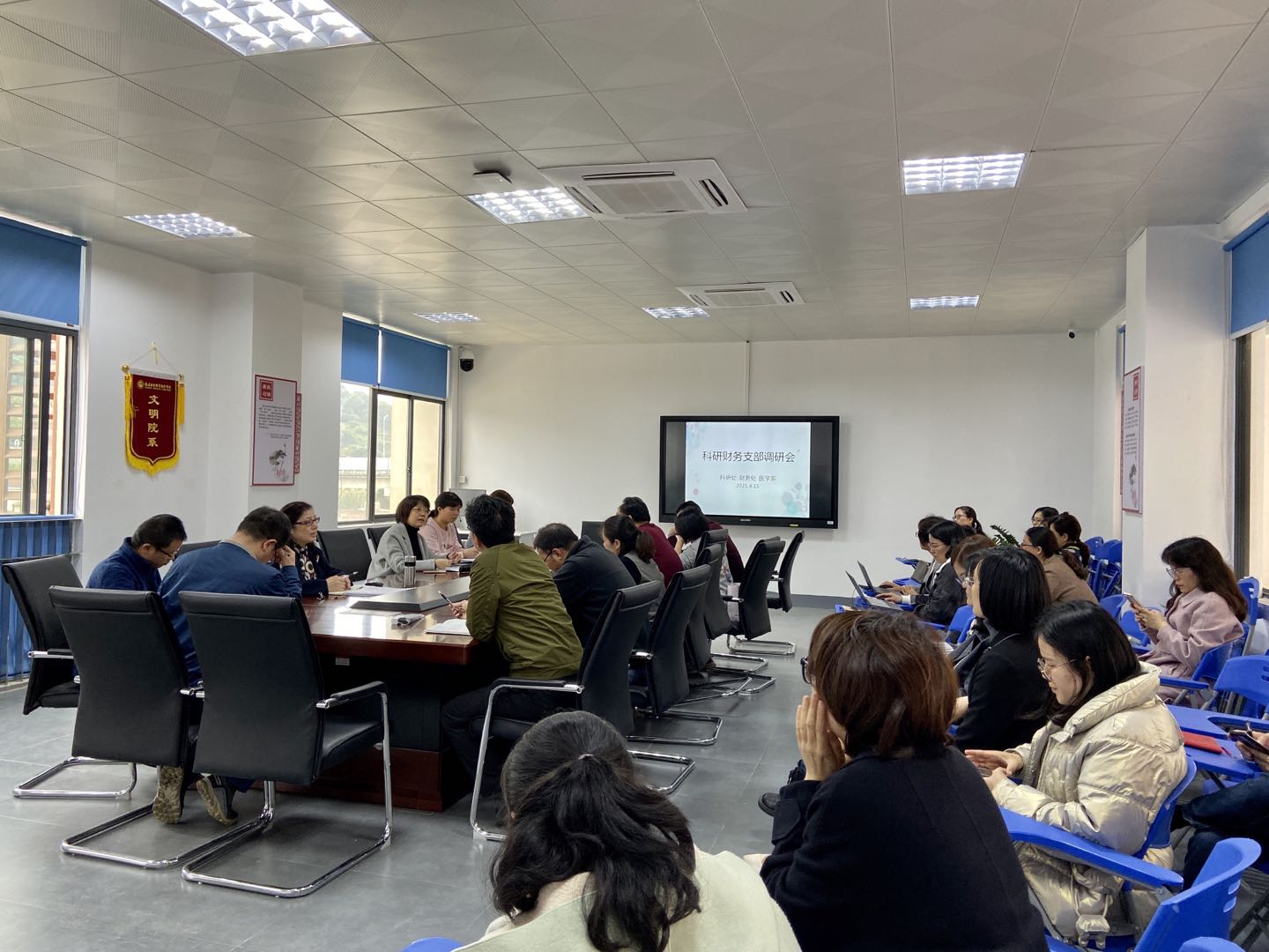 2021年4月15日,校領(lǐng)導(dǎo)鄭翠紅副院長率科研處、財務(wù)處黨支部黨員開展下基層調(diào)研活動。醫(yī)學(xué)系、護(hù)理學(xué)院、健康管理系、醫(yī)學(xué)基礎(chǔ)部主要領(lǐng)導(dǎo)及教師代表參加此次調(diào)研。本次調(diào)研采取集中調(diào)研方式,在醫(yī)學(xué)系會議室舉行。