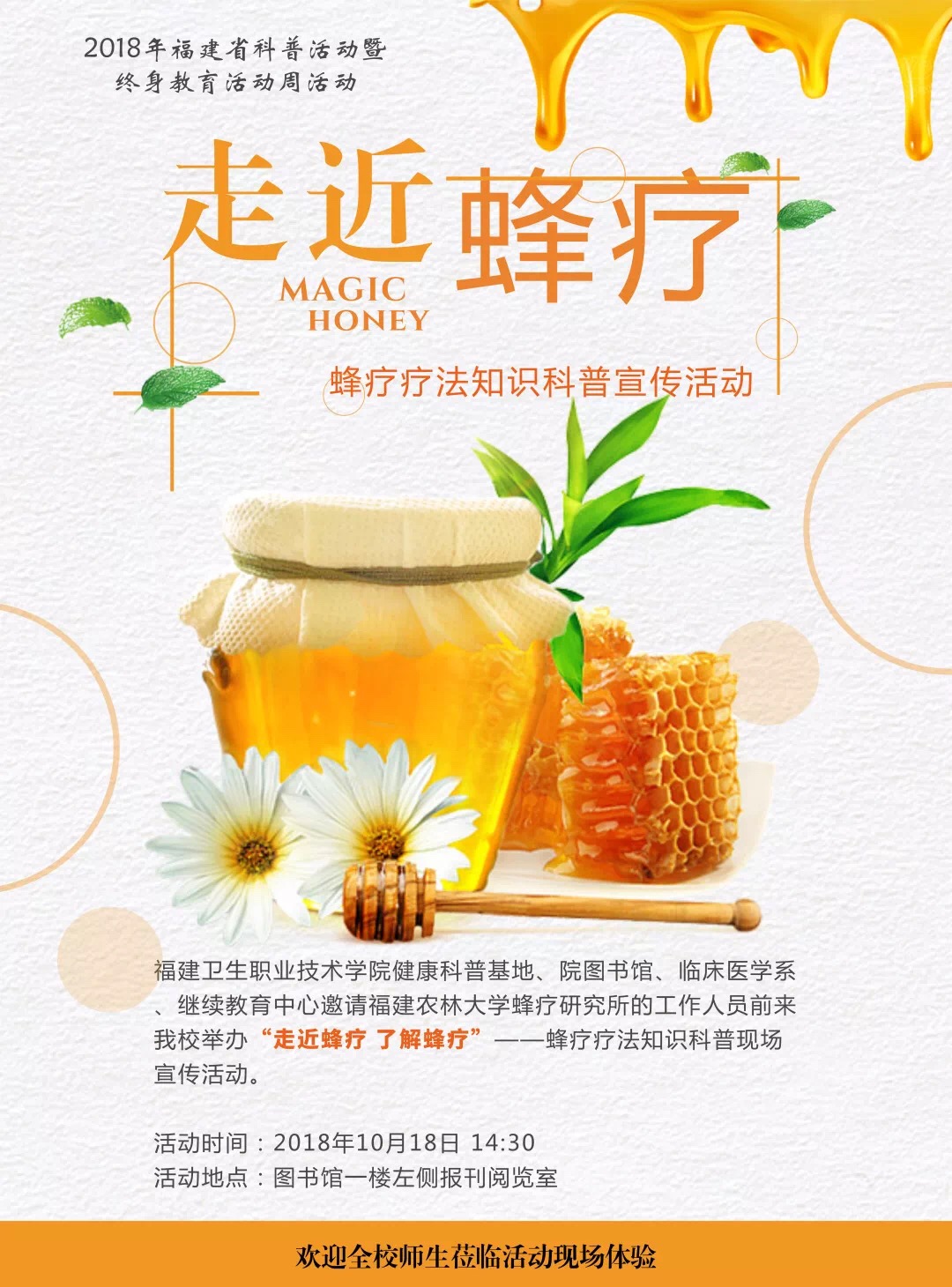 2018年10月18日,圖書館、臨床醫(yī)學(xué)系、繼續(xù)教育中心將邀請(qǐng)福建農(nóng)林大學(xué)蜂療研究所的工作人員前來我校舉辦“走近蜂療 了解蜂療”——蜂療療法知識(shí)科普現(xiàn)場宣傳活動(dòng) ,歡迎全院師生參與。