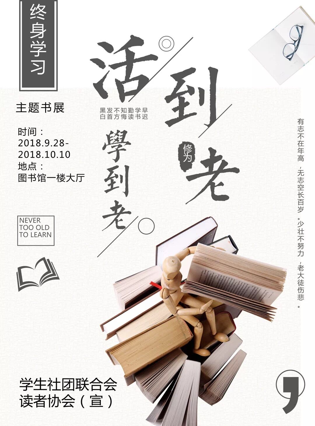 在“全民終身學(xué)習(xí)活動(dòng)周”來(lái)臨之際,圖書館特舉辦“活到老、學(xué)到老”主題書展,精選各類好書百余冊(cè)在圖書館一樓大廳進(jìn)行展示,持續(xù)時(shí)間為2018年9月28日至10月10日,歡迎師生讀者前來(lái)借閱。