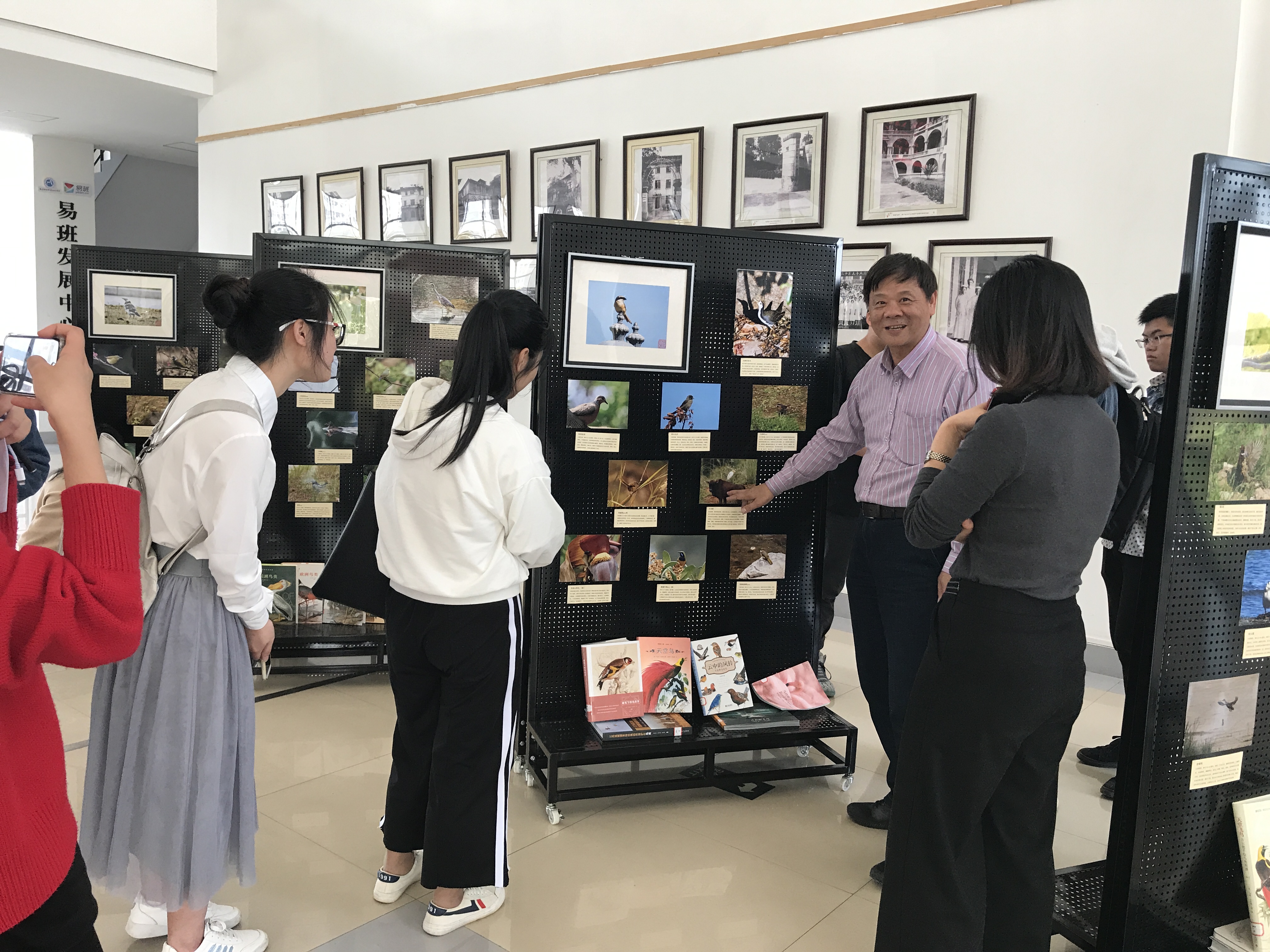 王屏老師對(duì)鳥(niǎo)類攝影情有獨(dú)鐘,通過(guò)多年的創(chuàng)作積累,拍攝到了許多珍貴相片,不但具有一定的藝術(shù)性,而且很有科普價(jià)值。值得一提的是,其中很多相片攝于我們校園,體現(xiàn)了我院清新自然的生態(tài)美?;顒?dòng)中他向大家科普了鳥(niǎo)類相關(guān)知識(shí),并生動(dòng)地描述了自己多年的拍鳥(niǎo)經(jīng)歷,現(xiàn)場(chǎng)有問(wèn)有答,氣氛活躍。之后,還帶領(lǐng)大家到圖書館一樓攝影展前細(xì)致的講解了他拍攝的作品,大家進(jìn)行了更加深入的交流討論。通過(guò)這次活動(dòng)增強(qiáng)了我們與大自然和諧共生的意識(shí),積極響應(yīng)了十九大報(bào)告提出的生態(tài)文明建設(shè)號(hào)召。