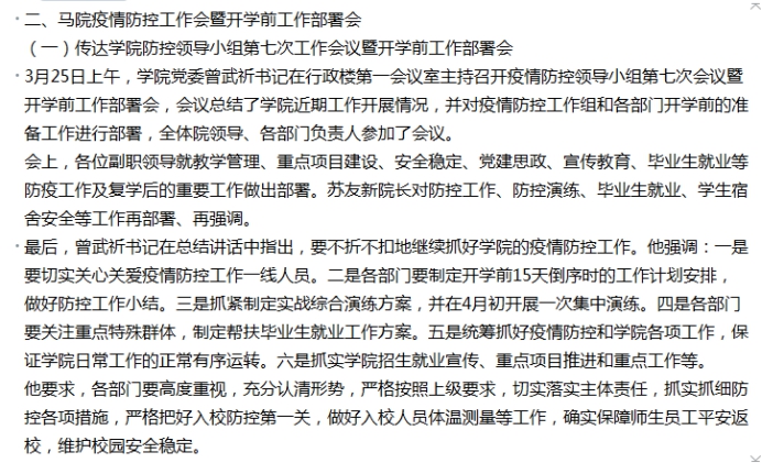 會(huì)上,熊美蘭院長首先傳達(dá)了校防控領(lǐng)導(dǎo)小組第七次工作會(huì)議暨開學(xué)前工作部署會(huì)精神。隨后,熊院長部署了馬院近期主要工作,分別就開學(xué)前15天的準(zhǔn)備工作、實(shí)戰(zhàn)演練,角色扮演、上班人員安排、教學(xué)、經(jīng)費(fèi)使用、安全隱患排查、就業(yè)工作、2020年重點(diǎn)項(xiàng)目建設(shè)、2020年第二屆“衛(wèi)聲杯”之戰(zhàn)“疫”之聲活動(dòng)等13項(xiàng)工作進(jìn)行了認(rèn)真安排和強(qiáng)調(diào)。接著,熊院長傳達(dá)學(xué)院務(wù)虛會(huì)精神及馬院交流匯報(bào)內(nèi)容:《探索構(gòu)建“3+X”思政實(shí)踐課育人模式》。
