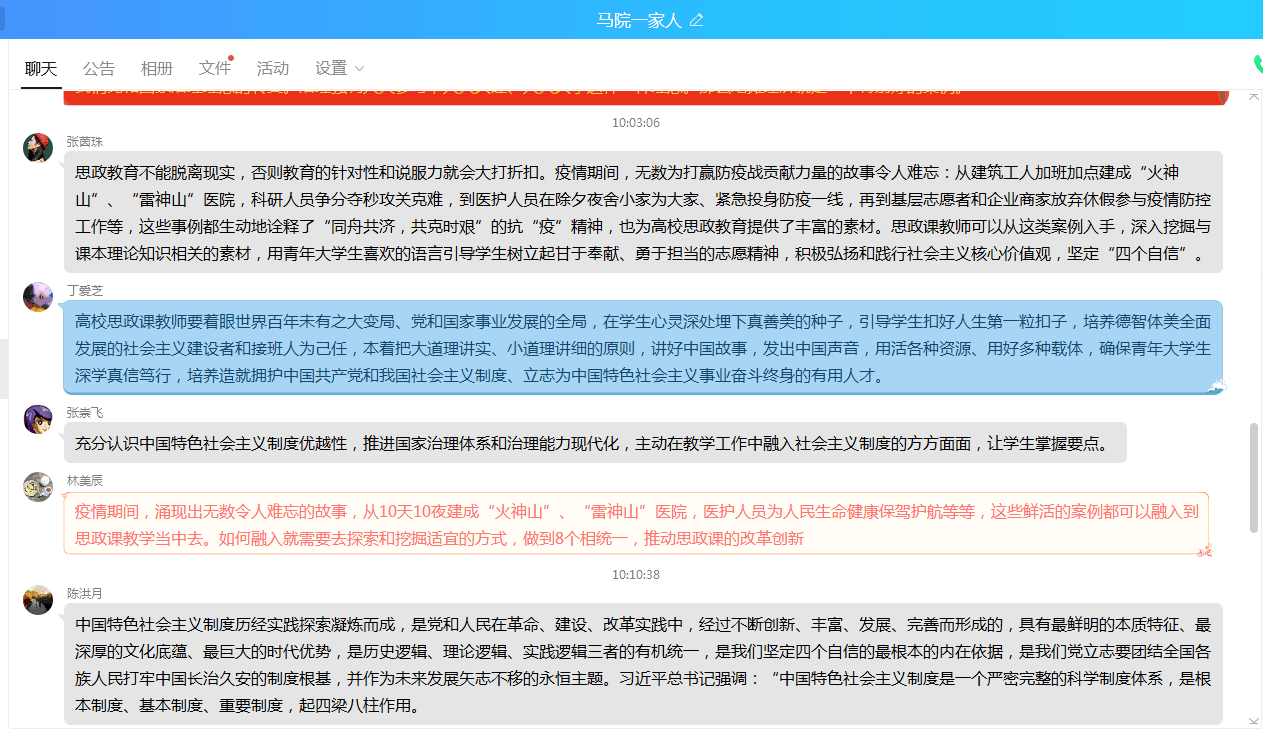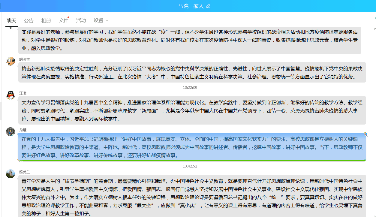 除了開展集中線上理論學(xué)習(xí)外,馬克思主義學(xué)院還組織全體教師開展了集中線上網(wǎng)絡(luò)研討,全體教師分別就“結(jié)合自身工作崗位實際,黨的十九屆四中全會精神、抗擊新冠肺炎疫情中涌現(xiàn)出的戰(zhàn)‘疫’精神如何融入到馬克思主義理論研究和思政課教學(xué)”以及“結(jié)合自身的思政主干課教學(xué),如何做到‘八個相統(tǒng)一’來推動課程改革創(chuàng)新”兩大主題開展了網(wǎng)絡(luò)研討,積極碰撞思維火花,建言獻(xiàn)策,以期更好地推動思政課程教學(xué)改革與創(chuàng)新。研討中,老師們紛紛表示作為思政教師,應(yīng)以“八個相統(tǒng)一”為教育教學(xué)標(biāo)準(zhǔn),增強(qiáng)教書育人本領(lǐng),把“思政小課堂”同“社會大課堂”結(jié)合起來,用心用情講好中國故事,傳播中國好聲音,打造有政治高度、有理論深度、有感情溫度的課堂,增強(qiáng)思政課程的思想性、理論性、親和力和針對性,起到強(qiáng)信心、暖人心、聚民心的作用,幫助青年扣好人生第一??圩?,培養(yǎng)擔(dān)當(dāng)民族復(fù)興大任的時代新人。