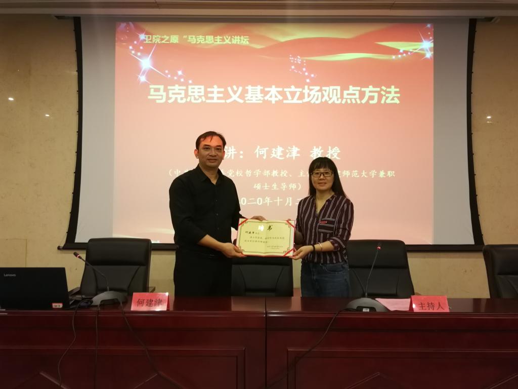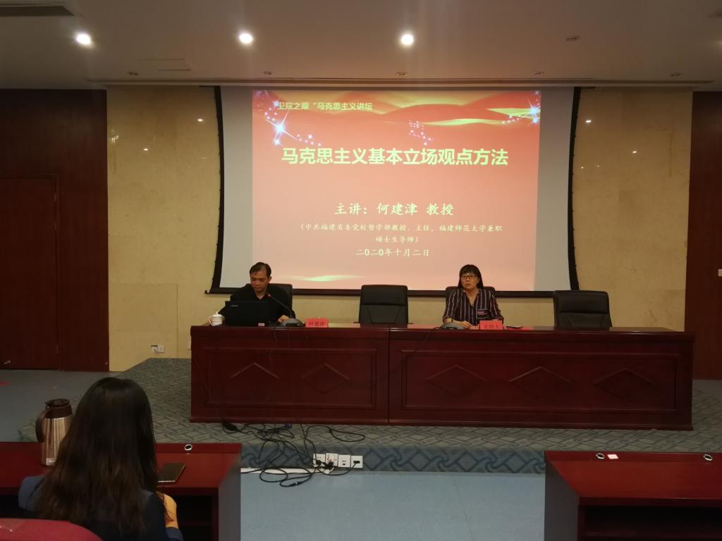 10月2日,為慶祝新中國(guó)成立71周年,“衛(wèi)院之原”馬克思主義講壇邀請(qǐng)中共福建省委黨校哲學(xué)部何建津教授為我校師生帶來了一場(chǎng)特殊而難忘的講座——《馬克思主義基本立場(chǎng)觀點(diǎn)方法》。全體思政課教師、校園網(wǎng)絡(luò)文化輿論引導(dǎo)隊(duì)隊(duì)員參加。主講人何建津教授,系中共福建省委黨校哲學(xué)部教授、主任,福建師范大學(xué)兼職碩士生導(dǎo)師,主要研究馬克思主義哲學(xué)經(jīng)典著作及哲學(xué)基礎(chǔ)理論與當(dāng)代社會(huì)發(fā)展。