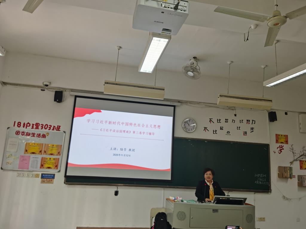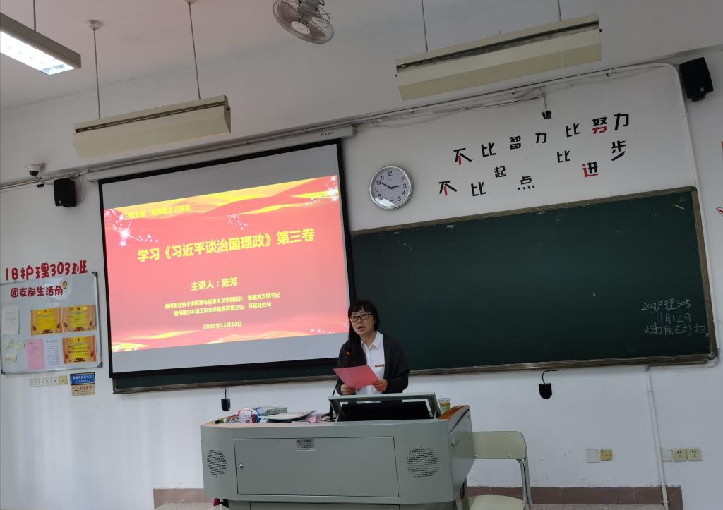 為深入學習《習近平談治國理政》第三卷,在學懂弄通做實上下功夫,推動習近平新時代中國特色社會主義思想入腦入心,以理論學習的新提升,不斷開創(chuàng)工作的新局面,2020年11月12日下午,學校特邀福州墨爾本理工職業(yè)學院思政部主任、科研處處長陸芳教授作《學習<習近平談治國理政>第三卷》專題講座。馬院全體教師以及學生代表參加了此次講座,講座由馬克思主義學院熊美蘭院長主持。