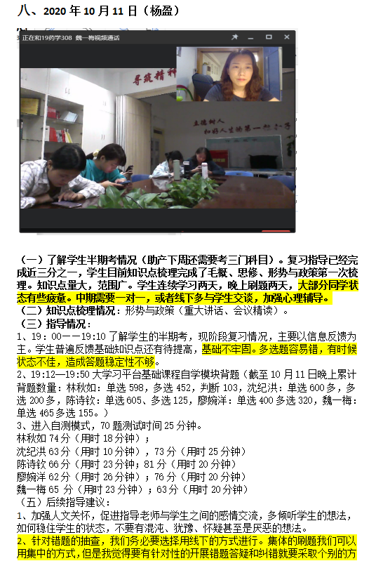 會(huì)根據(jù)學(xué)生的上課、實(shí)訓(xùn)、見習(xí)等多方面因素制定集訓(xùn)計(jì)劃,利用易班大學(xué)習(xí)平臺和學(xué)習(xí)通兩大線上平臺開展針對性測驗(yàn),檢驗(yàn)學(xué)習(xí)成果,測試結(jié)束后針對錯(cuò)題進(jìn)行分析講解,進(jìn)一步鞏固知識點(diǎn),并引導(dǎo)學(xué)生收集整理錯(cuò)題集。同時(shí)指導(dǎo)老師還根據(jù)輔導(dǎo)情況,制作指導(dǎo)手冊,每天動(dòng)態(tài)跟蹤記錄學(xué)生的學(xué)習(xí)情況,實(shí)時(shí)調(diào)整集訓(xùn)強(qiáng)度和進(jìn)度。除此之外,指導(dǎo)老師分別與選手結(jié)對開展線下針對性指導(dǎo),針對每個(gè)學(xué)生的知識儲備情況和薄弱點(diǎn),分析學(xué)生學(xué)習(xí)特點(diǎn),因材施教。