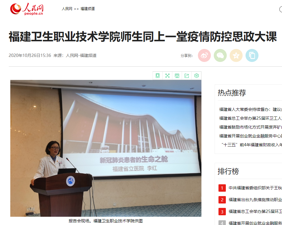 2020年特別針對(duì)偉大抗疫精神融入專(zhuān)題化教學(xué)上不斷突破,緊扣新冠肺炎疫情防控重點(diǎn)工作,組織全校師生同上全國(guó)高?!耙咔榉揽厮颊笳n”,打造《解碼戰(zhàn)勝疫情背后的中華優(yōu)秀傳統(tǒng)文化》等6堂思政課戰(zhàn)疫小課堂,編寫(xiě)50個(gè)“抗疫”思政案例?!赌拇蜈A(yíng)疫情防控阻擊戰(zhàn),聚力培育戰(zhàn)“疫”思想疫苗》、《福建衛(wèi)生職業(yè)技術(shù)學(xué)院開(kāi)講疫情防控思政第一課》、《疫情大考告訴我們什么?——疫情防控思政大課引閩衛(wèi)院熱議》等報(bào)道,獲得人民網(wǎng)、東南網(wǎng)、福建省教育廳、福建高校思政網(wǎng)、全國(guó)高職高專(zhuān)院校思政課建設(shè)聯(lián)盟網(wǎng)等主媒宣傳。