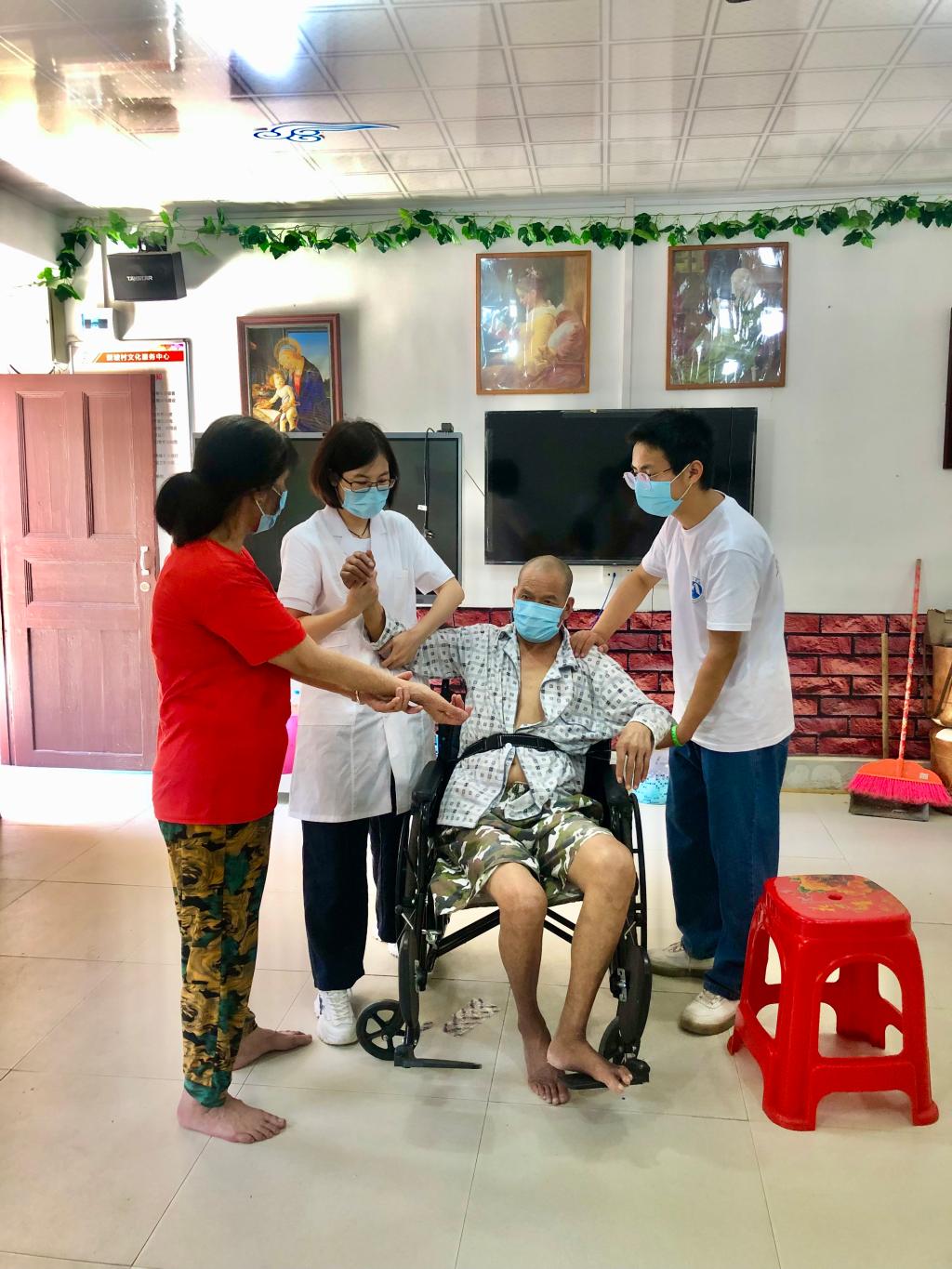 期間我們遇見了一位村民阿姨,在自己接受推拿、拔罐等服務(wù)后,覺得很滿意。她向我們講述了她的困難,她的愛人因手術(shù)后癱瘓?jiān)诖?,平日里靠她進(jìn)行照顧,由于鄉(xiāng)村醫(yī)療、交通條件限制,老人無法定時(shí)去醫(yī)院接受康復(fù)治療,希望我們能夠?yàn)樗睦瞎鲆恍┛祻?fù)醫(yī)療服務(wù)。聽聞了這件事,“馬上逐夢(mèng)隊(duì)”隊(duì)員就自發(fā)要去幫助這名患者,幾位同學(xué)同村民阿姨一起將其老公用輪椅推到位于半山腰上的村部。徐麗鶯老師為其進(jìn)行了肢體的被動(dòng)活動(dòng)和四肢牽伸,并對(duì)她進(jìn)行了康復(fù)醫(yī)療知識(shí)的指導(dǎo)。兩位老人表示非常感謝“馬上逐夢(mèng)隊(duì)”為他們提供的幫助。