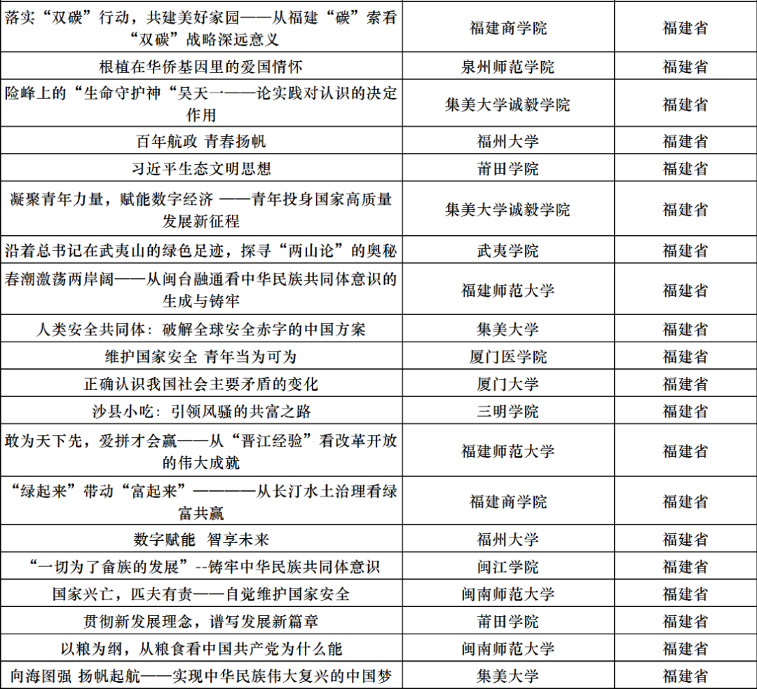 近日,由教育部高校思政課教學(xué)指導(dǎo)委員會主辦的第六屆全國高校大學(xué)生講思政課公開課展示活動評選結(jié)果公布,全國共評選出560件獲獎作品,福建高校43件作品獲獎。獲獎名單如下: