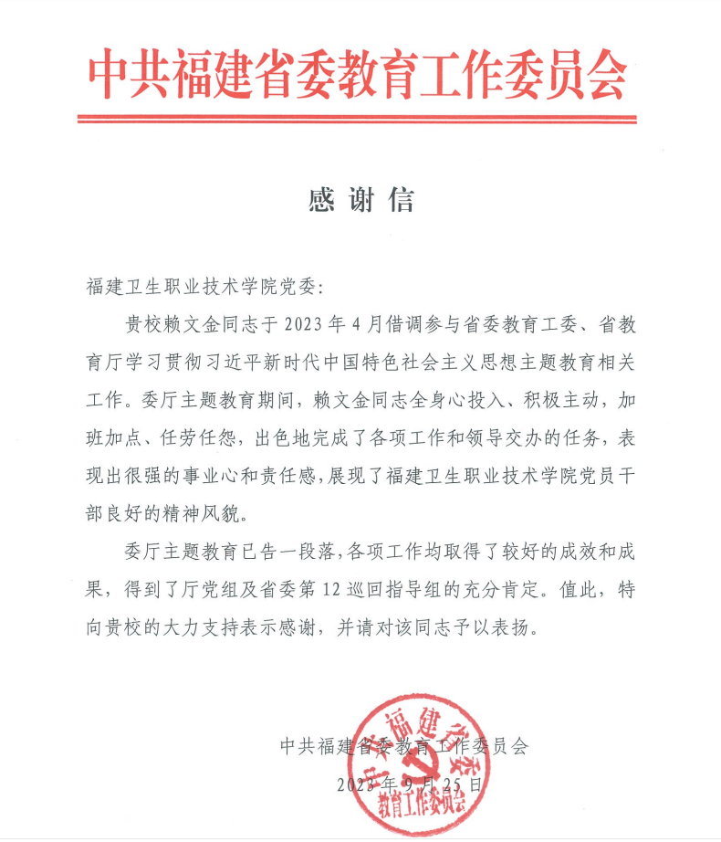 近日,我校收到中共福建省委教育工委的感謝信,對(duì)我校賴文金同志借調(diào)參與省委教育工委、省教育廳學(xué)習(xí)貫徹習(xí)近平新時(shí)代中國(guó)特色社會(huì)主義思想主題教育期間相關(guān)工作表示感謝。