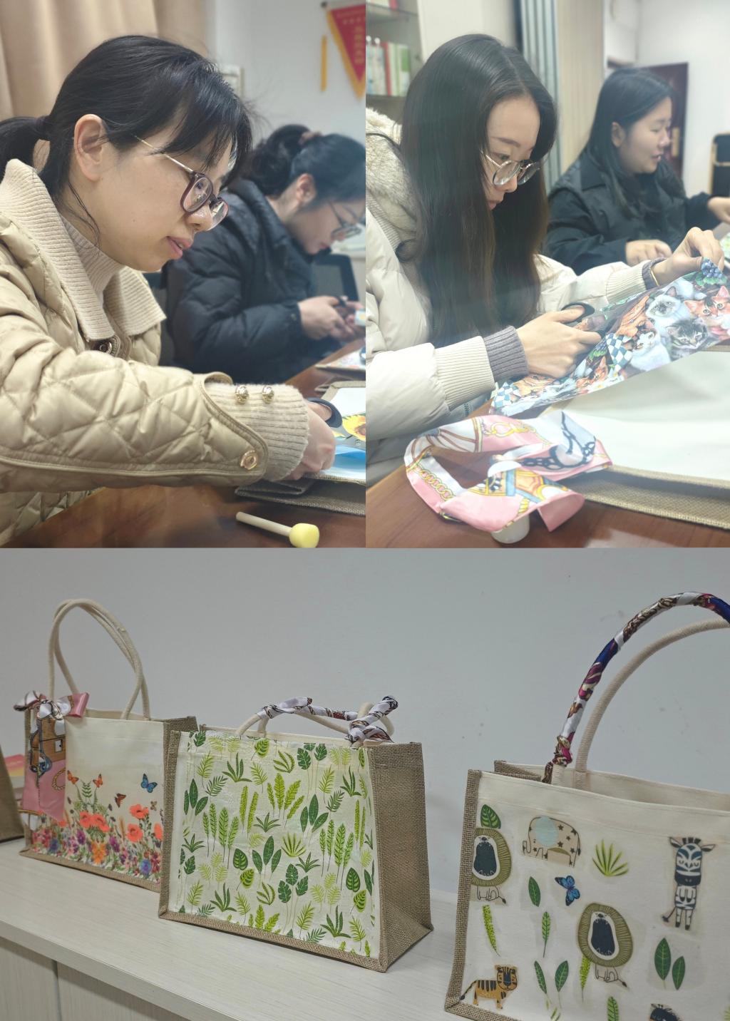 活動(dòng)現(xiàn)場(chǎng)氣氛熱烈,歡聲笑語不斷,大家紛紛拿起畫筆、剪刀和膠水,將五彩斑斕的圖案精心地拼貼在帆布包上,創(chuàng)作出獨(dú)一無二的藝術(shù)作品。