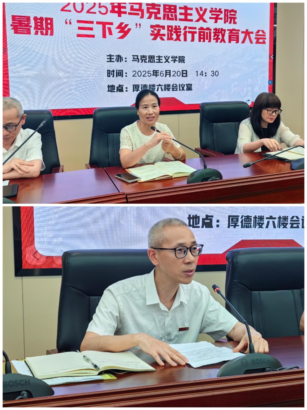 為深入學(xué)習(xí)貫徹習(xí)近平新時(shí)代中國(guó)特色社會(huì)主義思想,全面落實(shí)黨的二十大關(guān)于青年工作的重要部署,6月20日,馬克思主義學(xué)院在厚德樓六樓會(huì)議室舉行2025年暑期“三下鄉(xiāng)”社會(huì)實(shí)踐行前安全教育培訓(xùn)會(huì)。馬克思主義學(xué)院黨總支書(shū)記、院長(zhǎng)熊美蘭,副院長(zhǎng)來(lái)朋珍,第二黨支部書(shū)記胡濟(jì)林以及“馬上逐夢(mèng)隊(duì)”和“星火傳薪實(shí)踐隊(duì)”的指導(dǎo)老師和學(xué)生參加。會(huì)議由馬克思主義學(xué)院黨總支副書(shū)記賴(lài)文金主持。