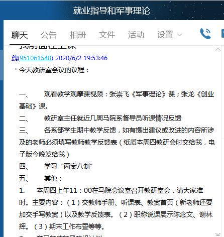 2020年6月2日晚8點(diǎn),軍事理論與就業(yè)指導(dǎo)教研室通過(guò)QQ開(kāi)展線上教研活動(dòng),活動(dòng)由教研室主任魏立娜教授主持,教研室全體教師參加。