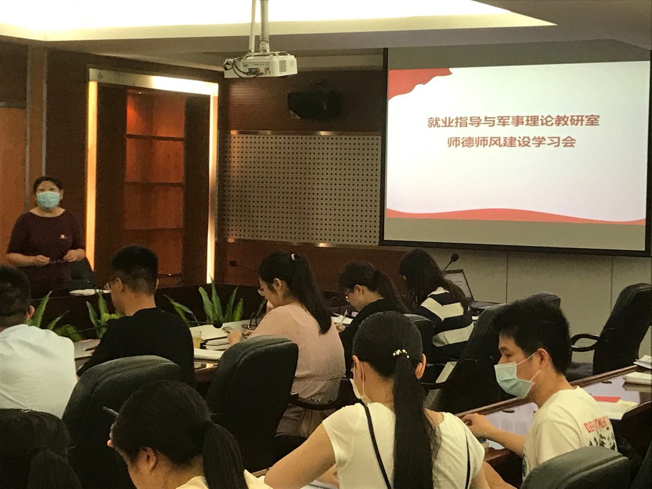 為了全面加強師德師風建設工作,提高教師的整體素質(zhì),建設一支師德高尚、業(yè)務精良的教師隊伍。就業(yè)指導和軍事理論教研室在行政樓四樓會議室組織開展師德師風建設和職稱說課交流教研活動,全體教師參加,會議由教研室魏立娜主任主持。
