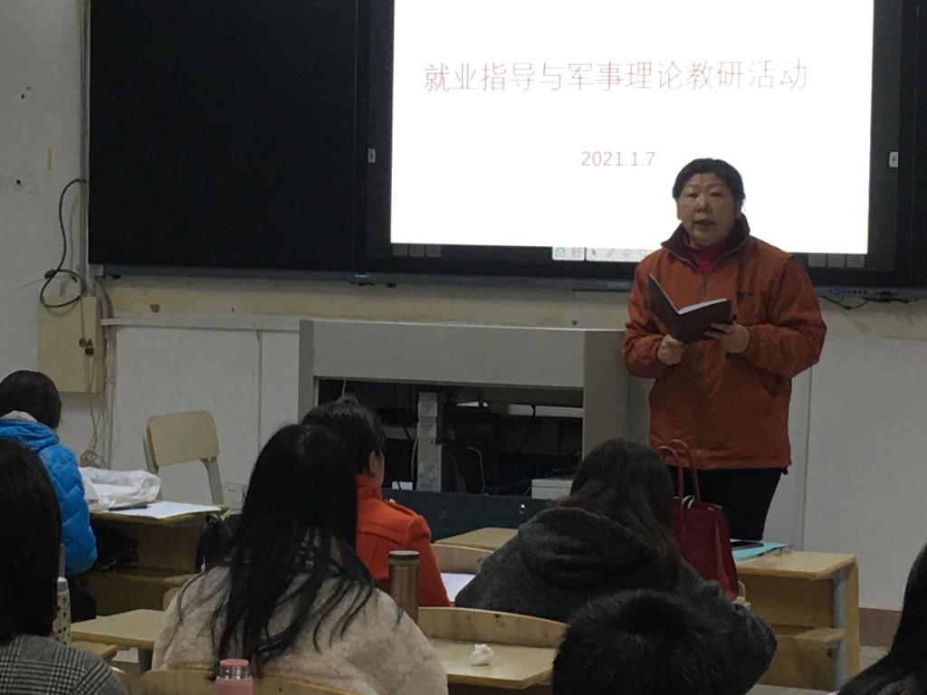 2021年1月7日上午,就業(yè)指導(dǎo)與軍事理論教研室在教學(xué)樓103開展本學(xué)期期末教研活動,活動由教研室主任魏立娜教授主持,教研室全體專兼職教師參加。